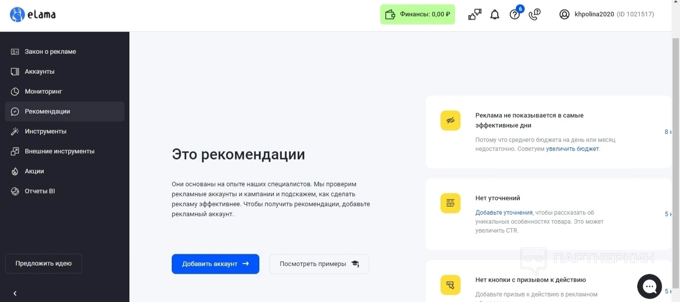 eLamaподбирает под рекламную кампанию советы и рекомендации, чтобы потом пользователь смог самостоятельно запустить кампанию без ошибок и потерь для бюджета.