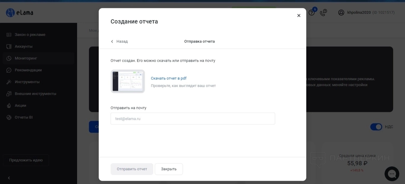 Какое-то время система анализирует показатели, после чего пользователю открывается окно, в котором находится готовый отчет. Просмотреть его в данном окне не представляется возможным, поэтому его можно только скачать в формате PDF или отправить на почту кому-либо. История о том, что пользователь запрашивал какой-то отчет в демо-версии, не сохраняется и нигде не отображается.