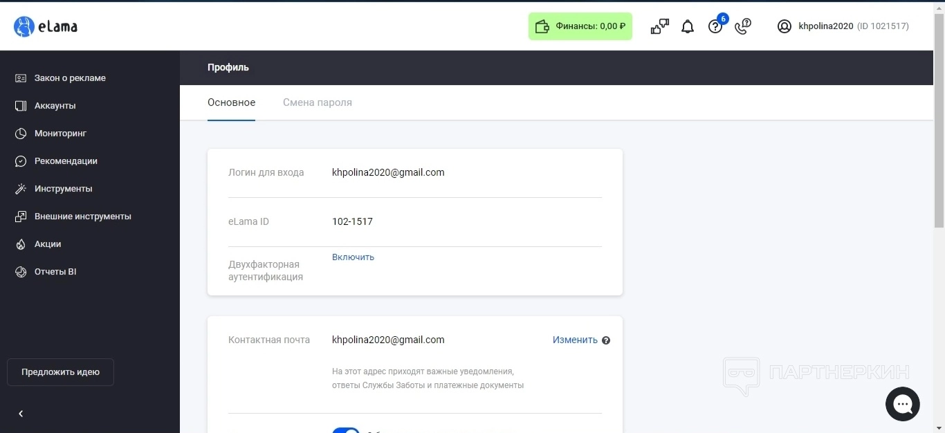 В разделе Редактирования профиля доступны основные настройки для удобства использования кабинета и профиля. Здесь можно настроить двухфакторную аутентификацию, а также уведомления и куда они будут приходить. Можно также изменить почтовый ящик и пароль для авторизации.