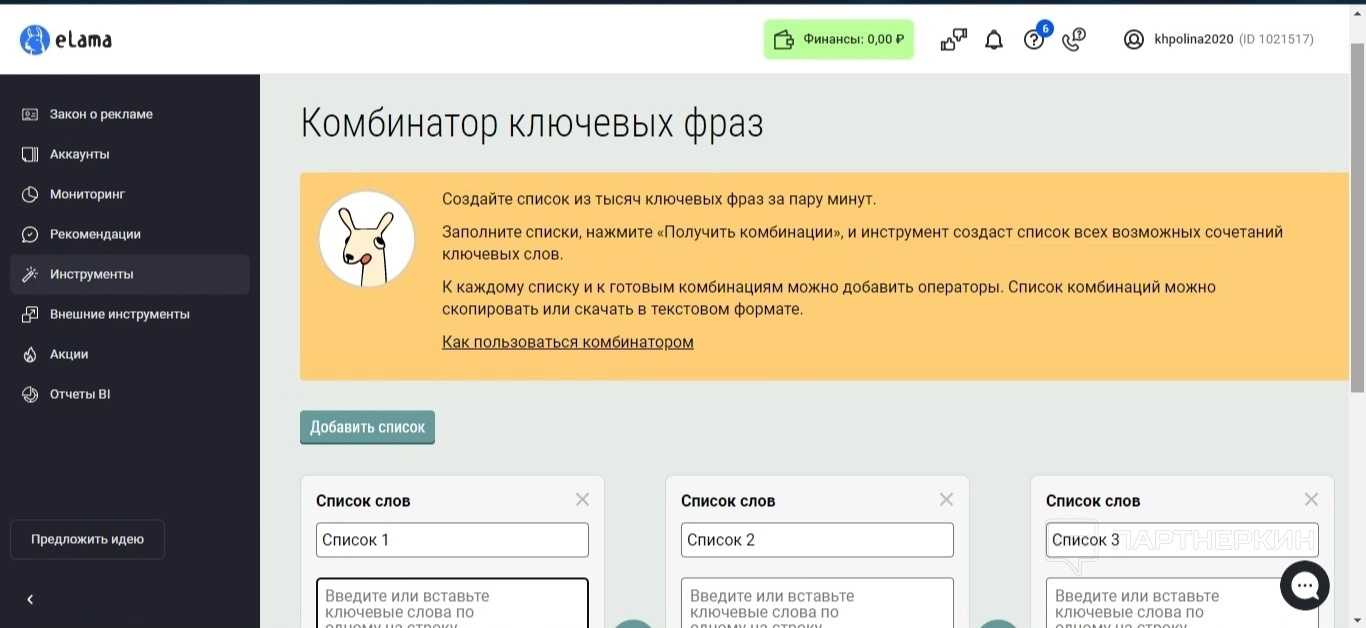 Для нескольких инструментов регистрация рекламного кабинета вовсе не нужна. Одной из таких функций является комбинатор ключевых фраз.