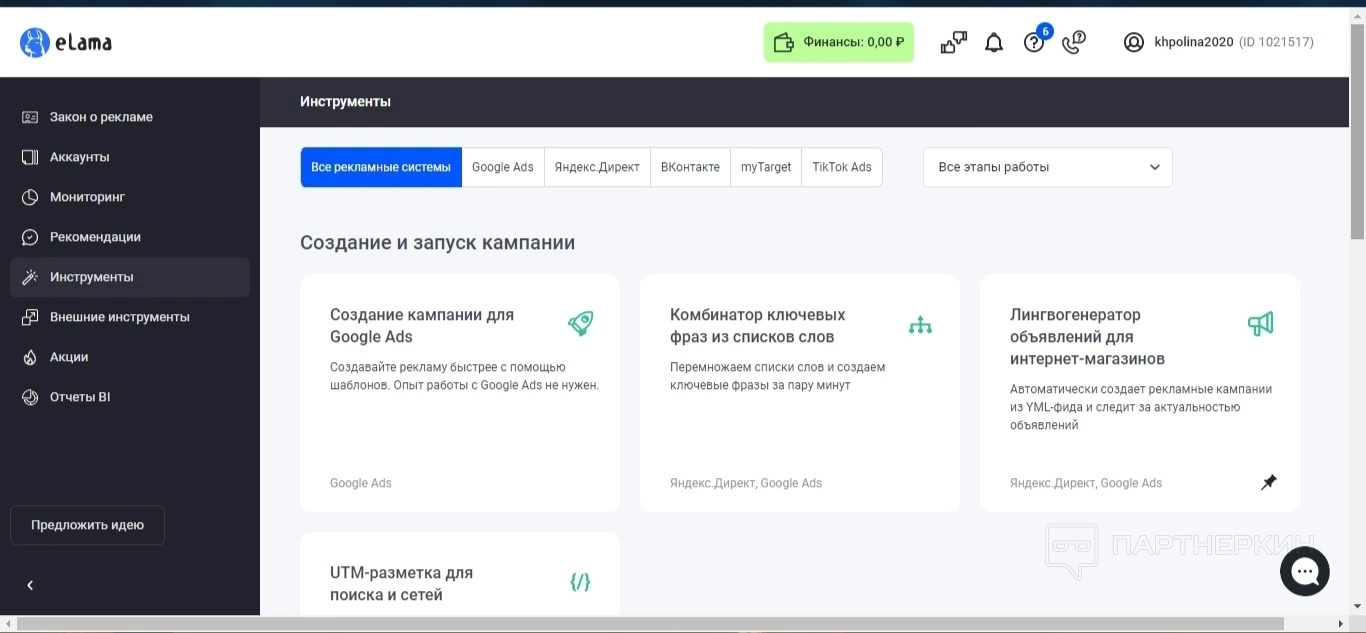 В разделе Инструменты собраны подборки доступных инструментов для той или иной рекламной сети. Здесь есть и Google Ads с другими площадками, и комбинатор ключевых фраз, и, по сути, все те инструменты, которые мы перечисляли в самом начале. Чтобы начать их использовать, достаточно выбрать подходящий и нажать на него. Не забываем, что необходимо подключение рекламного кабинета для использования большинства функций сервиса, однако есть несколько инструментов, которые работают и без данного шага.