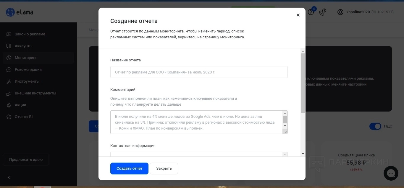 Далее открывается специальное окно, в котором достаточно большое количество полей для заполнения. Здесь необходимо назвать свой отчет, прописать все сопутствующие комментарии (например, с какими исходными данными запускалась кампания и какой результат сейчас, и так далее), можно добавить фотографию логотипа и так далее. После проделанных шагов, нажимаем на кнопку «Создать отчет».