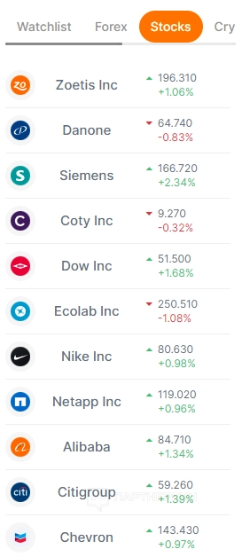 - Акции. Пользователи могут следить за акциями ведущих компаний с котировками в реальном времени и доступными торговым параметрами.