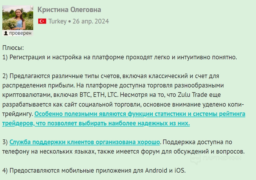Девушка Кристина отмечает простую регистрацию и легкую настройку на платформе. Доступно большое разнообразие криптовалют. Особенно полезные функции статистики и системы рейтинга трейдеров. Есть служба поддержки клиентов, а также мобильные приложения для Android и iOS.