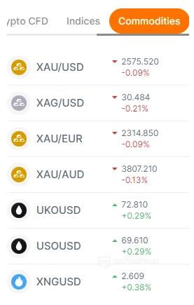- Сырьевые товары. Здесь отображается золото, нефть и сельскохозяйственные продукты с актуальными ценами и изменениями на рынке.