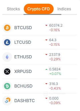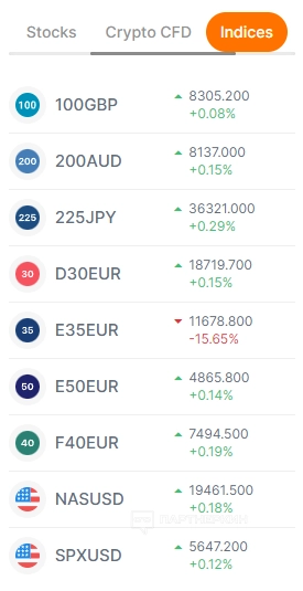 - Индексы. Глобальные фондовые индексы (например, 100GBP, 200AUD, D30EUR и другие), где отображается их динамика и ключевые показатели.