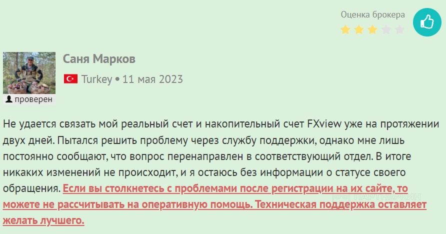 Будьте готовы к тому, что техническая поддержка не всегда будет своевременно реагировать на ваши обращения. Например, в этом отзыве пользователь не смог связать реальный счет и накопительный счет FXview.