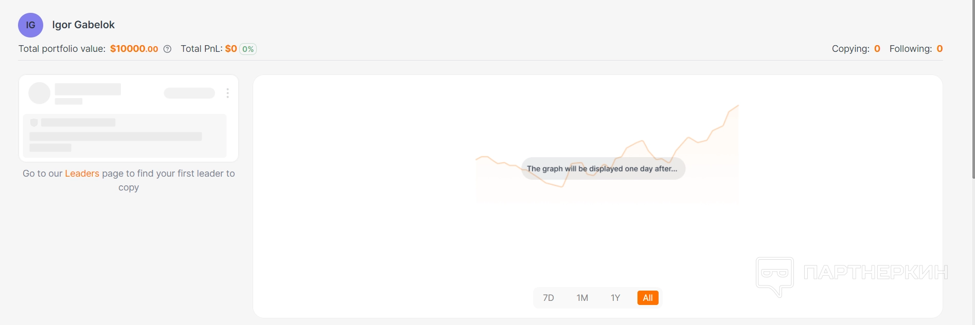На этой странице представлен рейтинг трейдеров, за которыми можно следить и копировать их сделки. Здесь отображаются их ключевые показатели: доходность, уровень риска, количество подписчиков, время на платформе, общее число сделок.