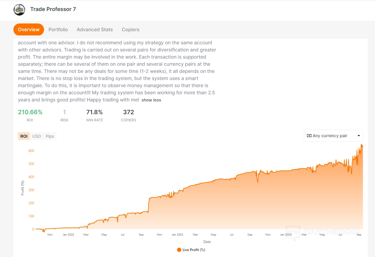 - Overview. Здесь трейдер рассказывает о своей стратегии, дает советы о рекомендуемом минимальном депозите, да и вообще пишет все, что посчитает нужным.
