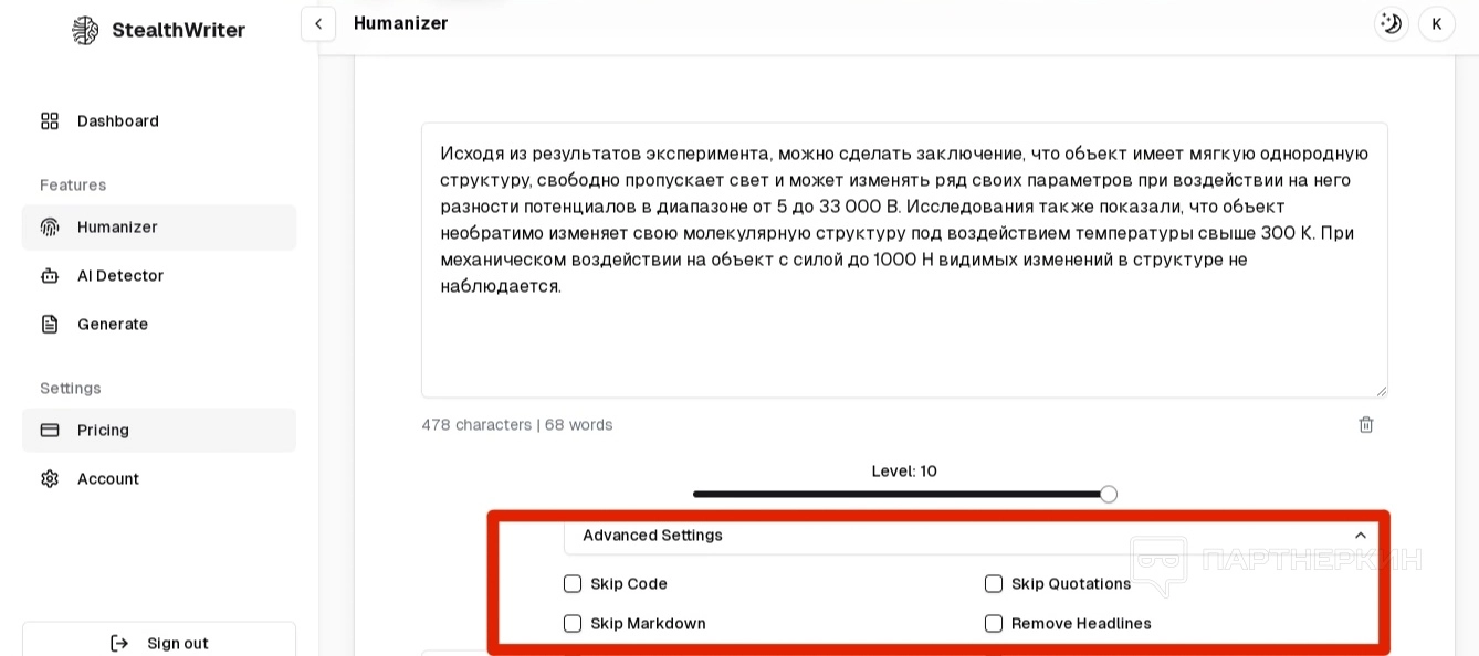 Далее этот же текст отправляем в Humanizer для улучшения его качества и читабельности. Получить высокую оригинальность можно с помощью расширенных настроек, которые находятся чуть ниже поля для ввода текста. Чем выше ползунок уровня доступной модели, тем тщательнее и качественнее нейронная сеть будет проверять и исправлять контент.