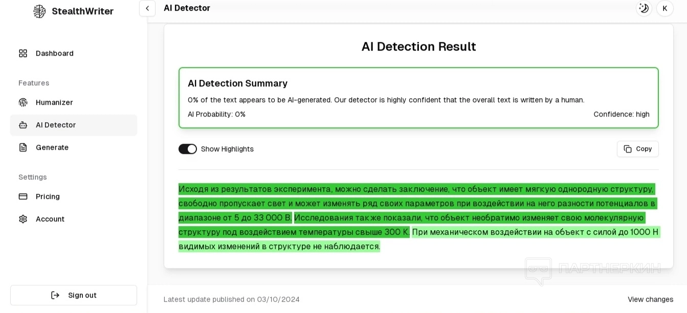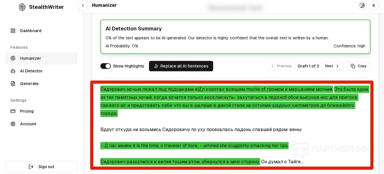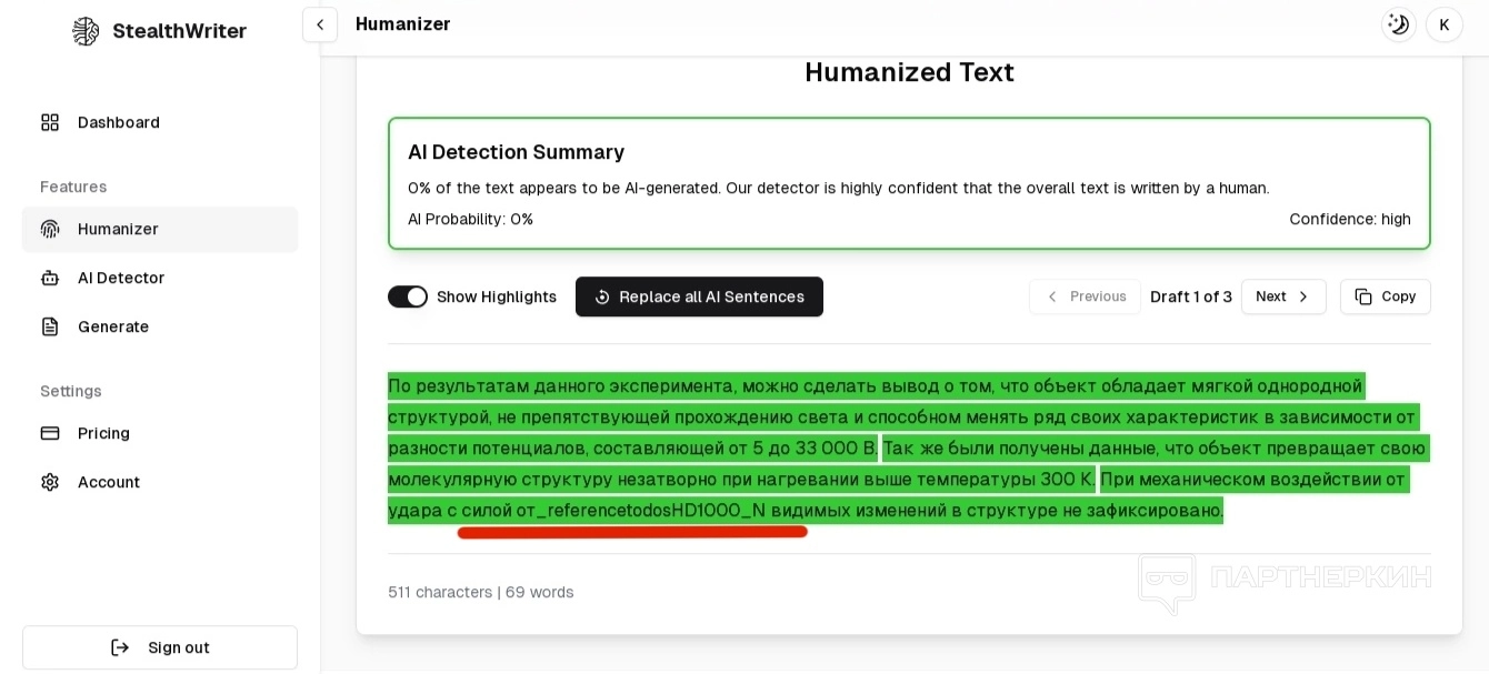 Проверка занимает достаточно малое количество времени, поэтому ее результаты можно увидеть уже спустя пару минут. Если текст выделен зеленым цветом и процентный показатель оригинальности менее 50% — материал уникальный или не сгенерирован нейронной сетью.