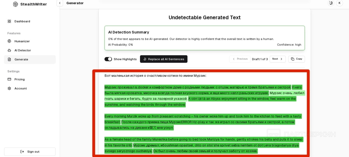 На скриншоте можно увидеть, как нейронная сеть в некоторых случаях дает сбой в отношении русского языка: появляются некоторые вставки англоязычного (и не только) контента. Закономерность это или случайность можно узнать благодаря еще одной проверке.