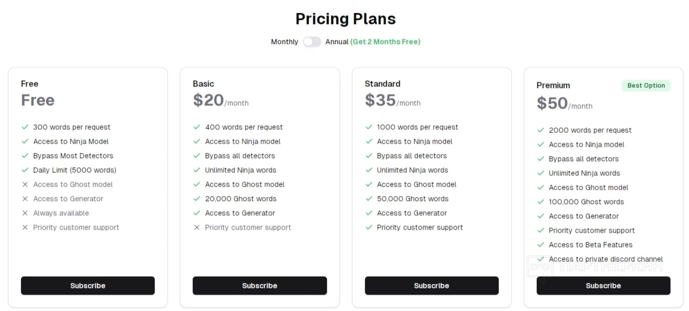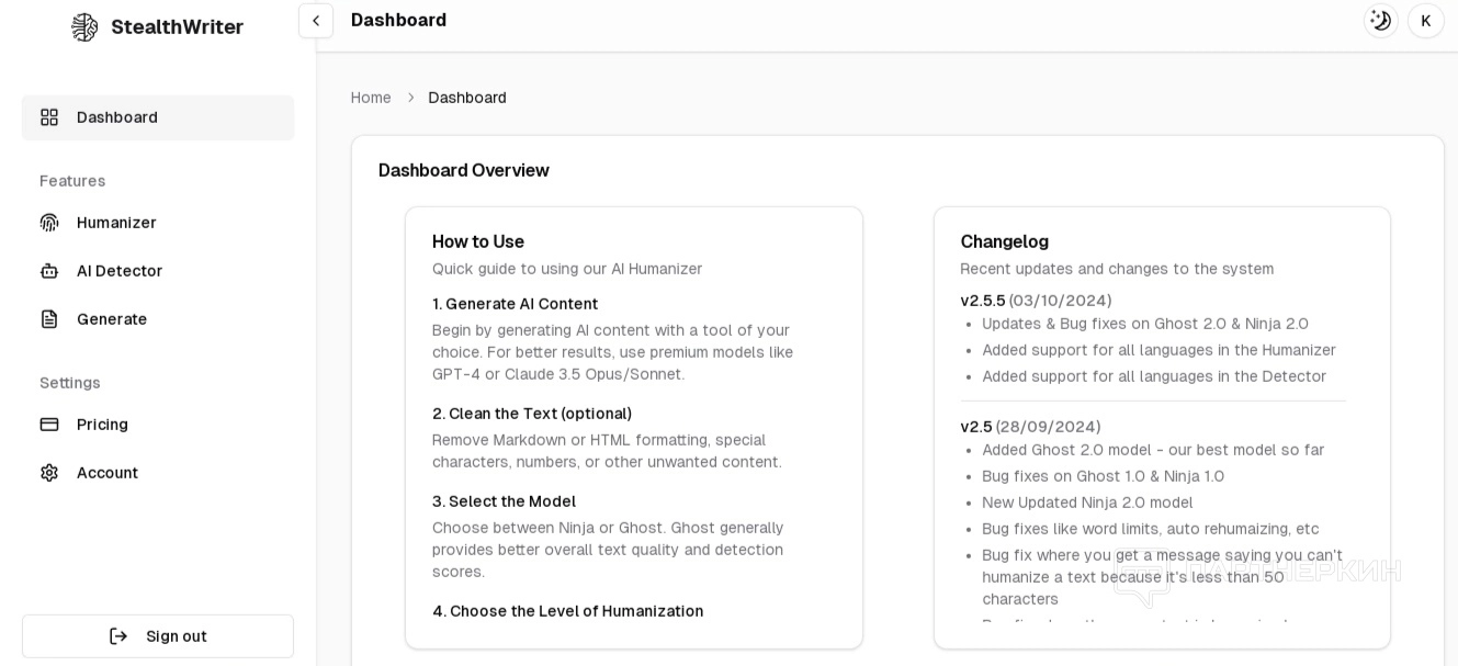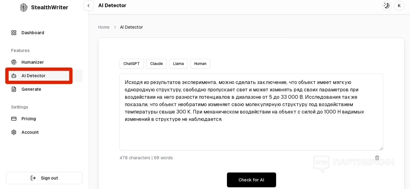 - Ai Detector — раздел для проверки готового текста на наличие AI-контента, сгенерированного сторонними нейронными сетями.