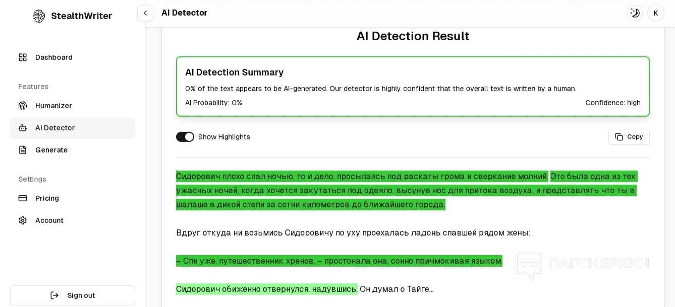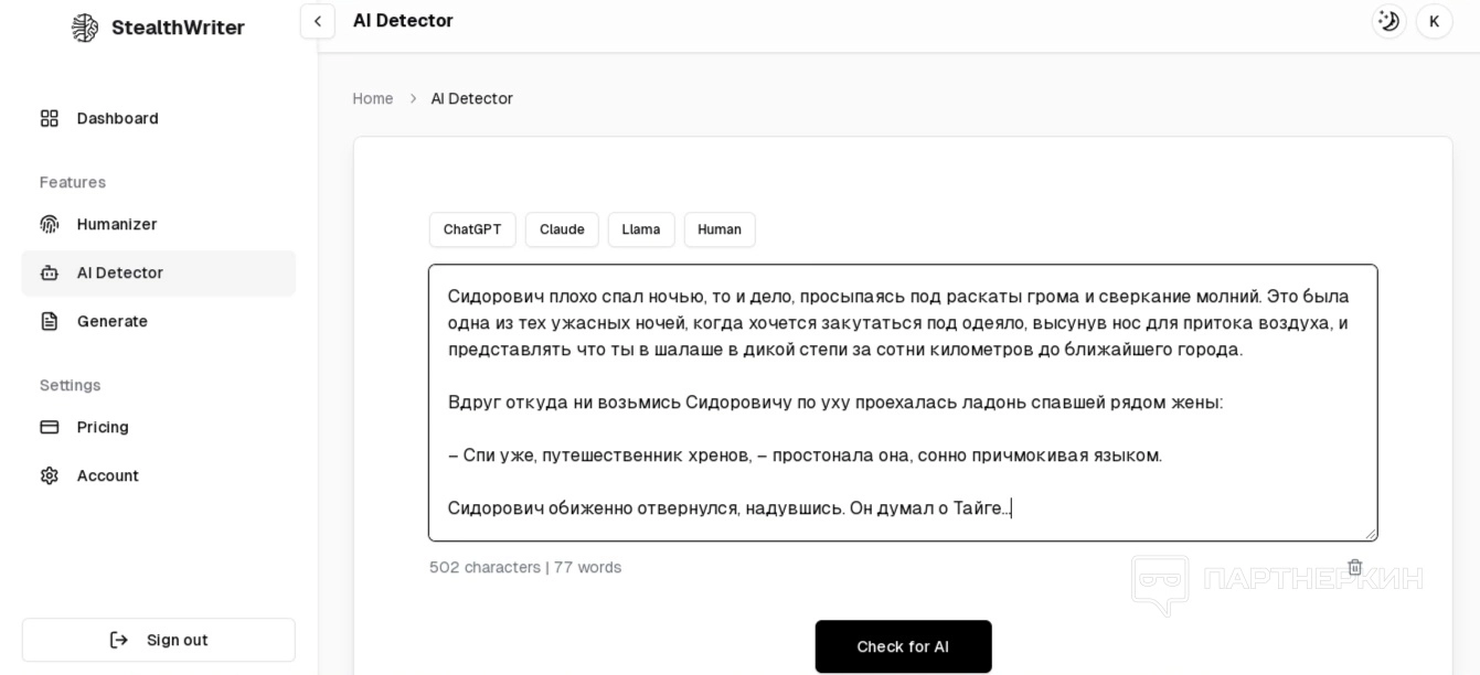 Для второго теста на универсальность сервиса возьмем отрывок текста художественного стиля. Первым делом также прогоняем его через детектор.