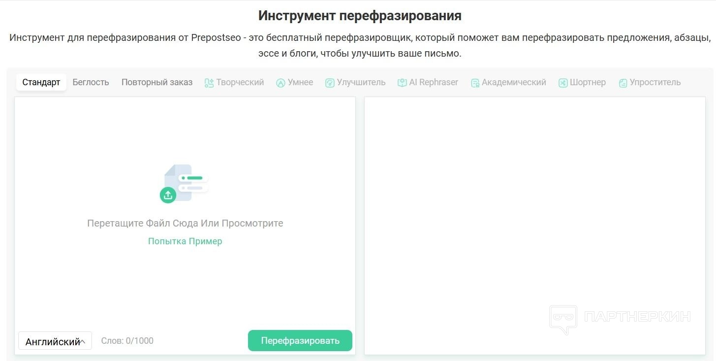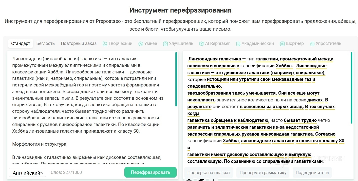 - Smarter Mode (премиум) — интеллектуальный режим, который изменяет текст, делая его уникальным и устраняя плагиат. Это лучший режим для создания контента, который полностью отличается от исходного.