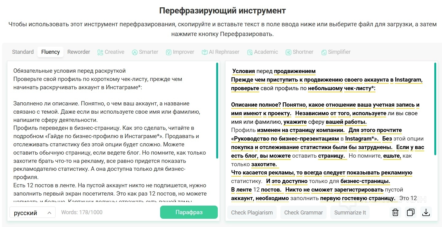 - Fluency Mode — более продвинутый режим, который не только заменяет слова, но и улучшает плавность текста, корректируя фразы и предложения для лучшего восприятия.
