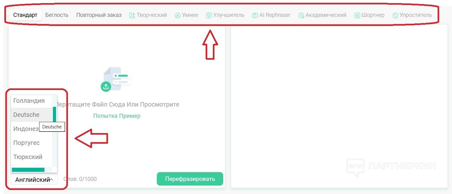 - Выберите нужный режим перефразирования (по умолчанию выбран «Стандартный»).