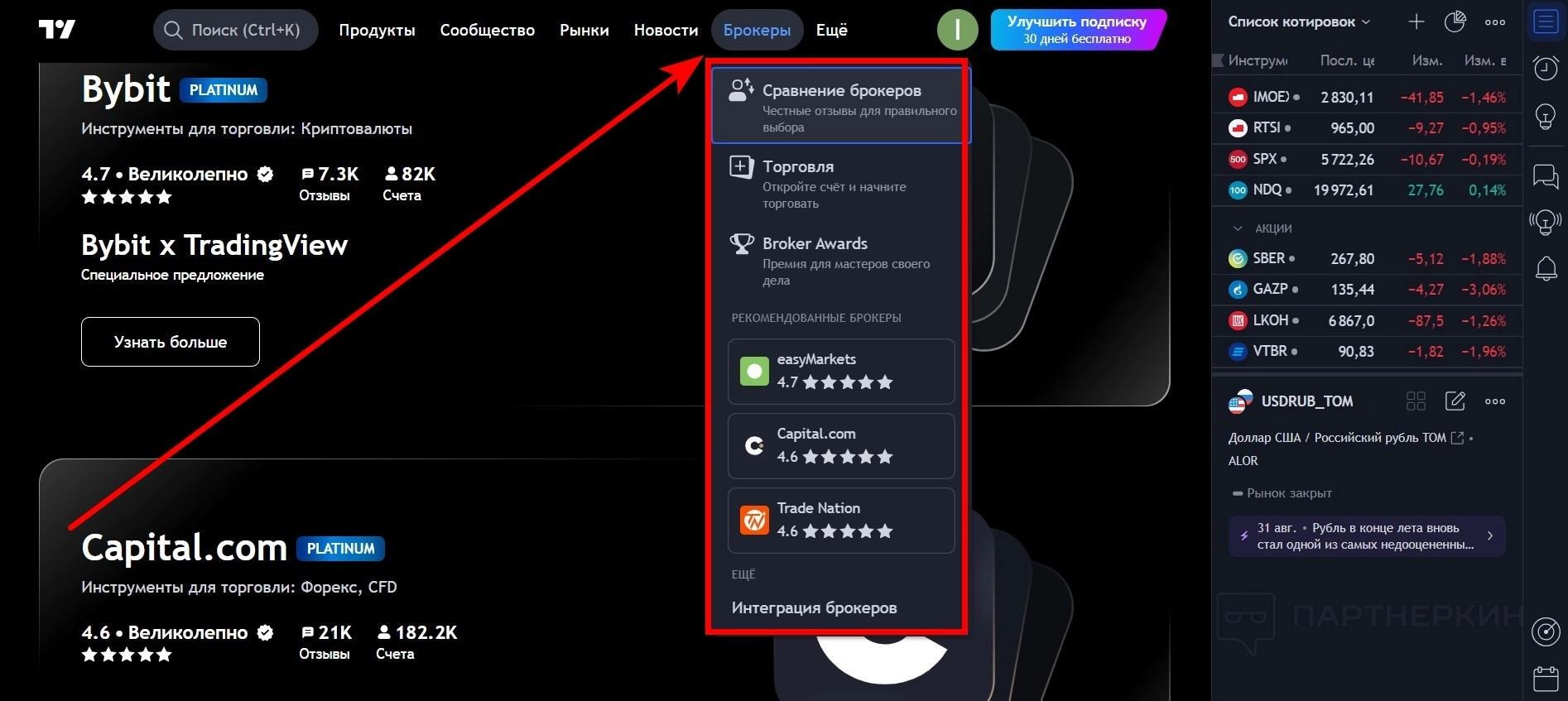 Отдельный раздел, который открывает доступ к популярным посредникам. То есть позволяет торговать через брокеров. Такой формат подходит для тех, кто больше доверяет «живым» профессионалам. Для этого нужно открыть счёт и выбрать подходящего брокера. В графе «Сравнение брокеров» есть краткая информация по каждому специалисту.