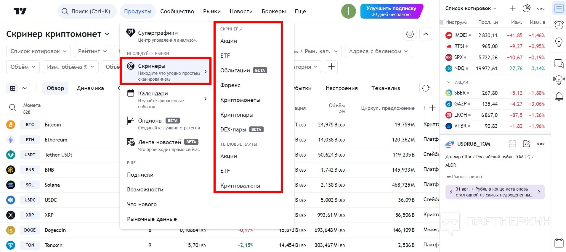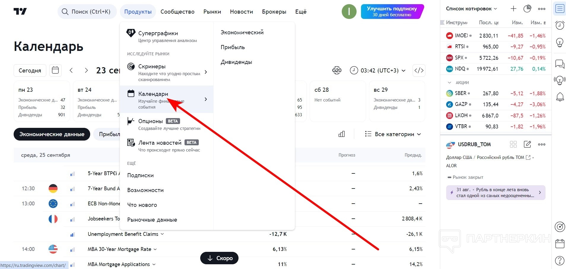 - быстрый доступ к скринерам и календарю;