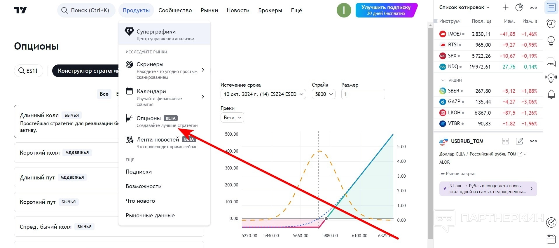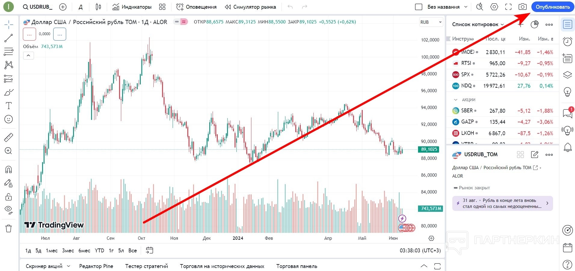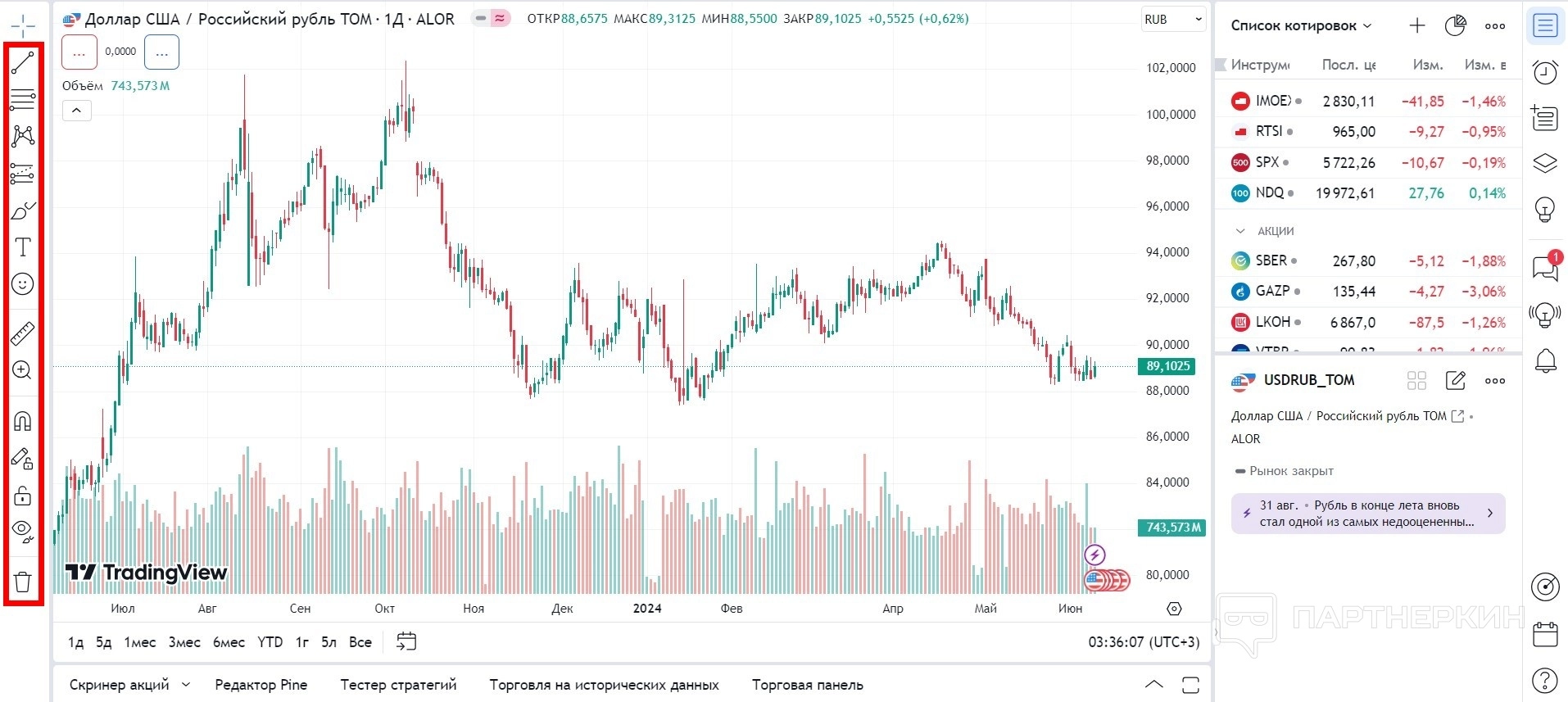 В левой части экрана расположены инструменты для рисования: линии тренда, текст, вилы, шаблоны и отметки. Эти функции помогают пользователям визуализировать свои торговые стратегии, делая их понятными как для личного использования, так и для публикации в сообществе.