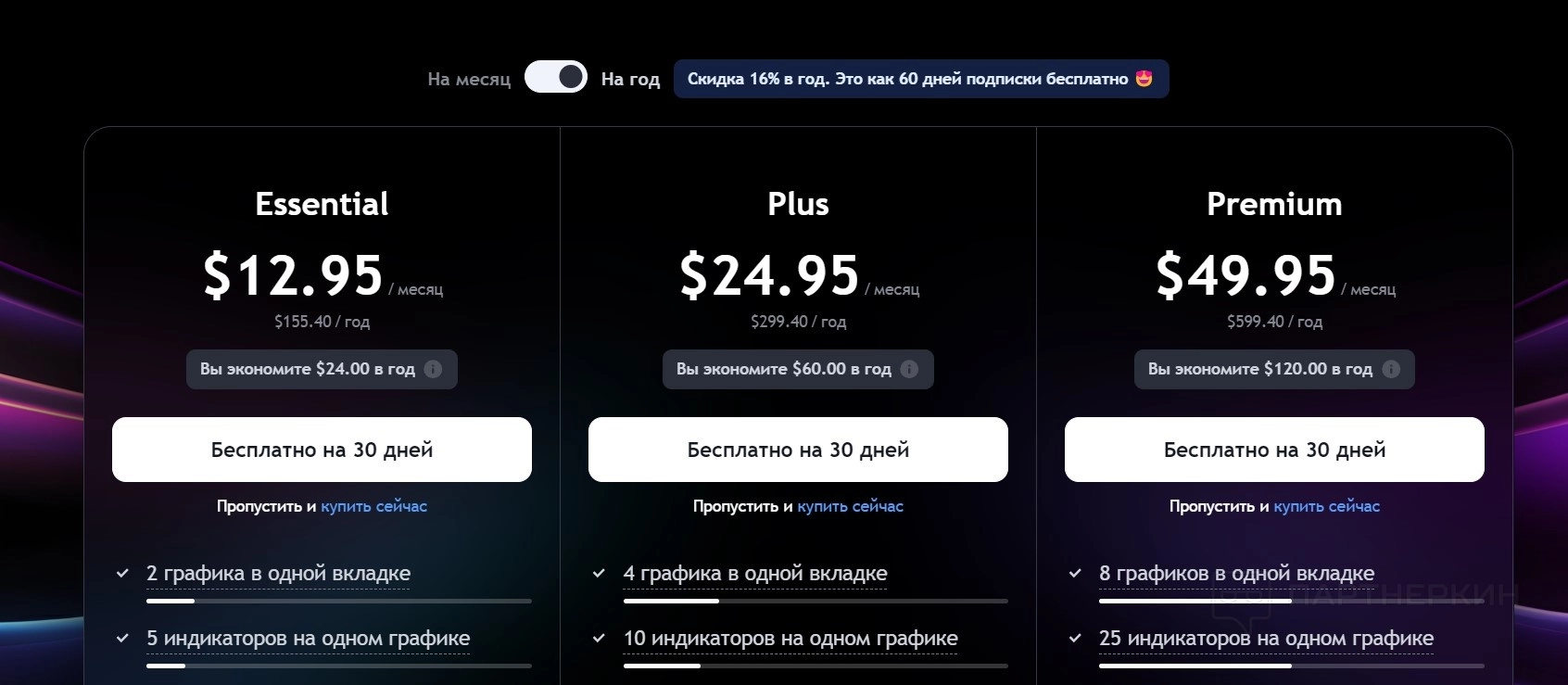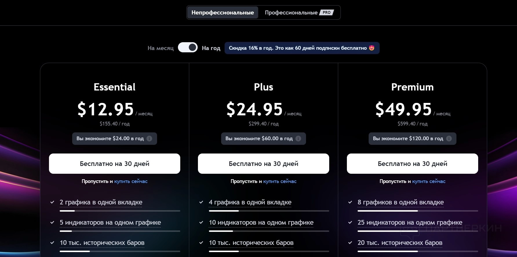 - Essential . Базовый платный план стоимостью $14,95 в месяц или $155,40 в год (экономия $24 в год). Пользователь получает возможность работать с 2 графиками в одной вкладке и 5 индикаторами на графике. План предоставляет доступ к 10 000 исторических баров и 20 оповещениям (как ценовым, так и техническим). Реклама отключена, что улучшает рабочий процесс. Также доступны дополнительные инструменты, такие как профиль объема, симулятор рынка и настраиваемые интервалы.
