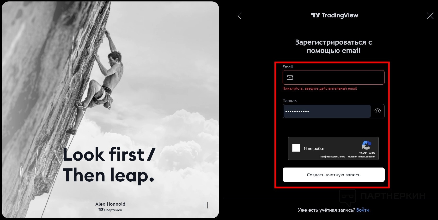 - Если вы выбрали электронную почту, укажите её и придумайте пароль. Также пройдите капчу и нажмите на кнопку «Создать учётную запись». На почту придёт письмо со ссылкой. Нужно по ней перейти, чтобы верифицировать аккаунт.