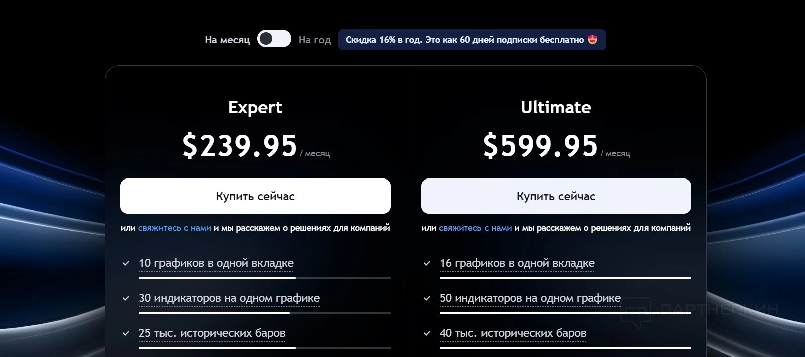 - Ultimate . Самый полный и продвинутый тариф, который стоит $599,95 в месяц или $5 999,40 в год (экономия $1 200 в год). Пользователь может работать с 16 графиками в одной вкладке и 50 индикаторами на одном графике. Объем исторических данных увеличен до 40 000 баров, а количество оповещений — до 1 000. Этот план включает все доступные инструменты и функции платформы, включая тиковые интервалы, оповещения на секундных графиках, кластерный объем и максимальное количество одновременно открытых графиков — до 200.