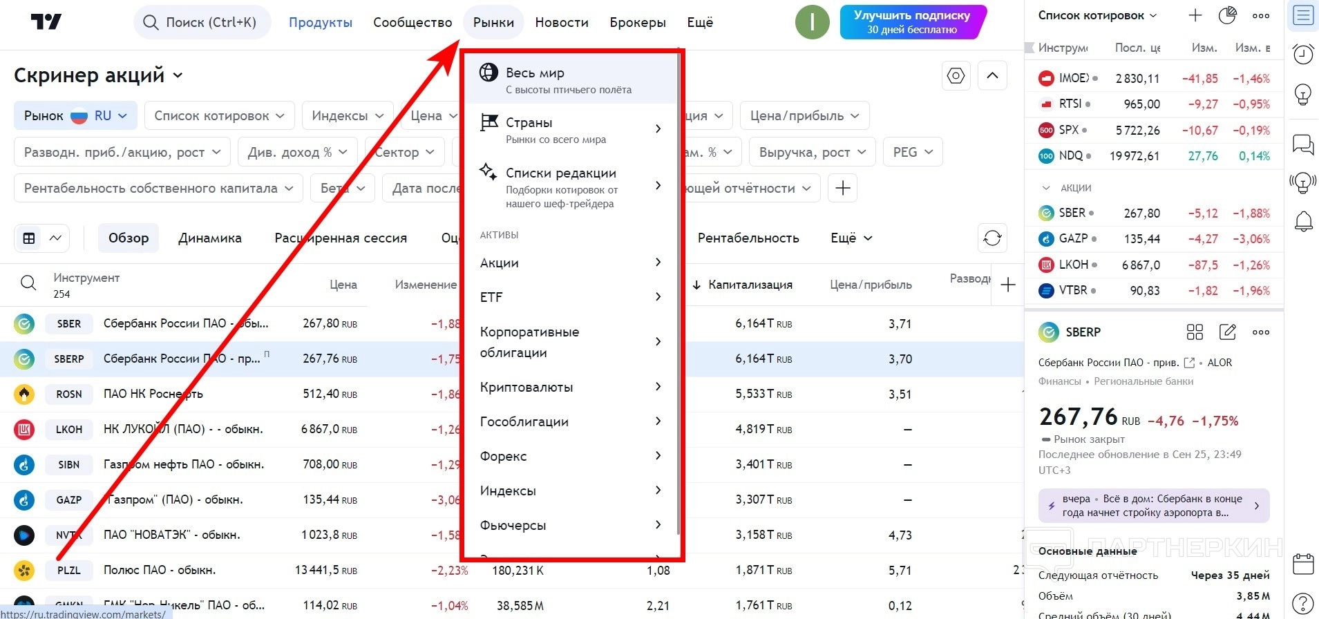 Рынки можно анализировать все сразу, выбирать по странам. Также есть раздел «Списки редакции». Это подборки котировок от шеф-трейдера.