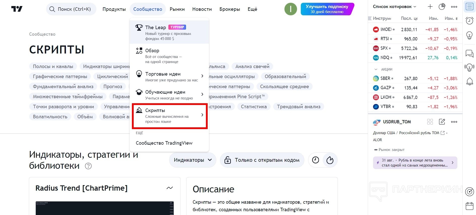 Это обобщённое название для индикаторов, стратегий и библиотек. Многие из них были созданы самими пользователями. Также есть скрипты от разработчиков. В этом разделе содержится более 100 000 стратегий и индикаторов, которые используют на платформе ТрейдингВью. Некоторые скрипты свободно применяют для торговли. Другие — если их создатель дал такое разрешение.