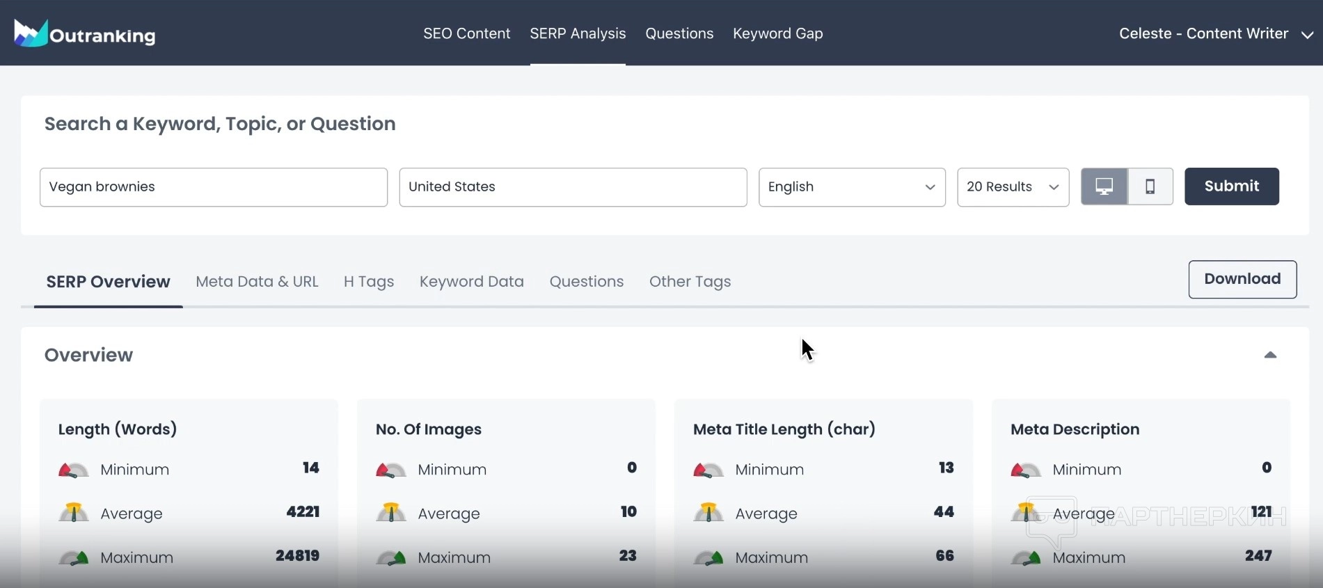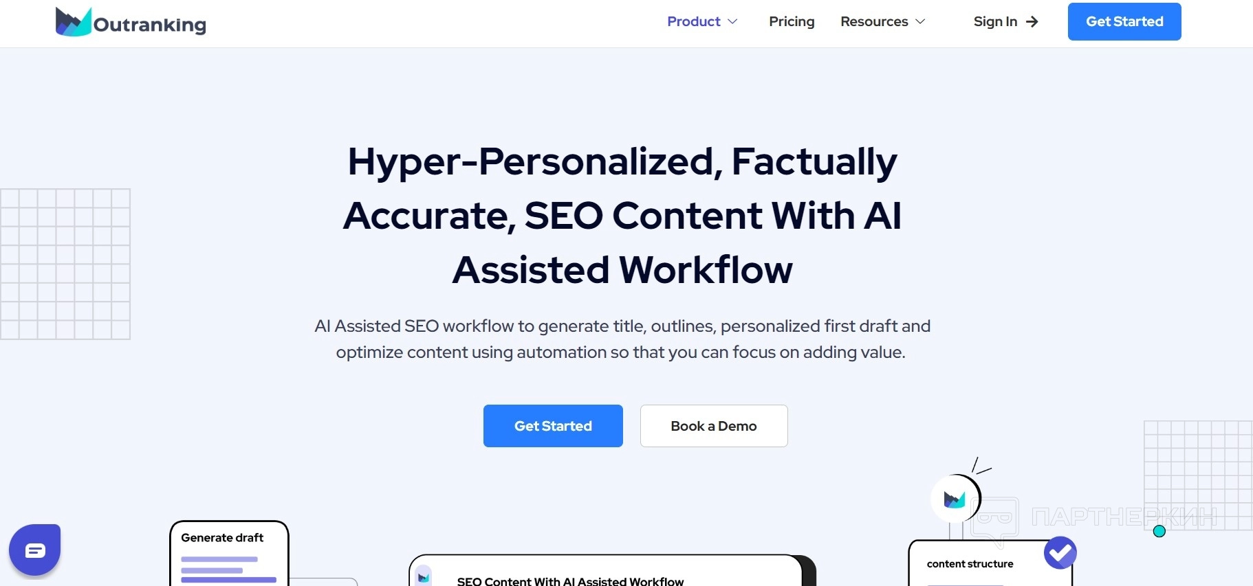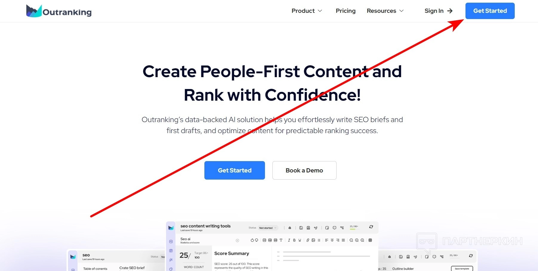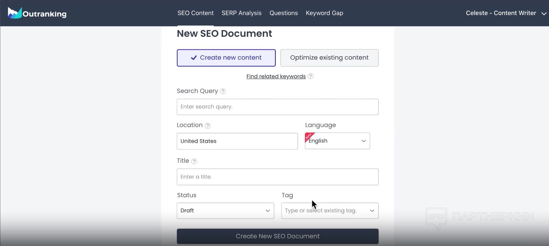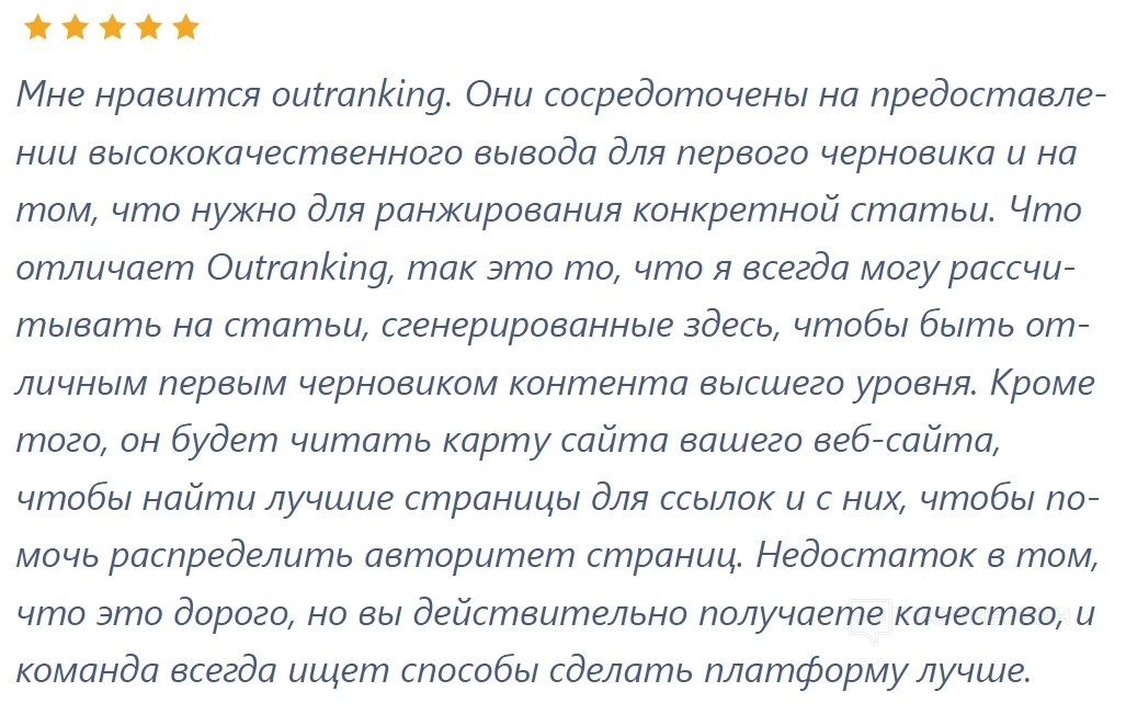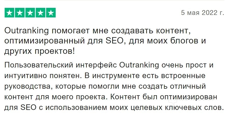Основные достоинства Outranking заключаются в его интуитивно понятном и простом интерфейсе, который включает встроенные руководства. Это особенно полезно при создании качественного контента для различных проектов, что позволяет даже новичкам эффективно использовать инструмент.