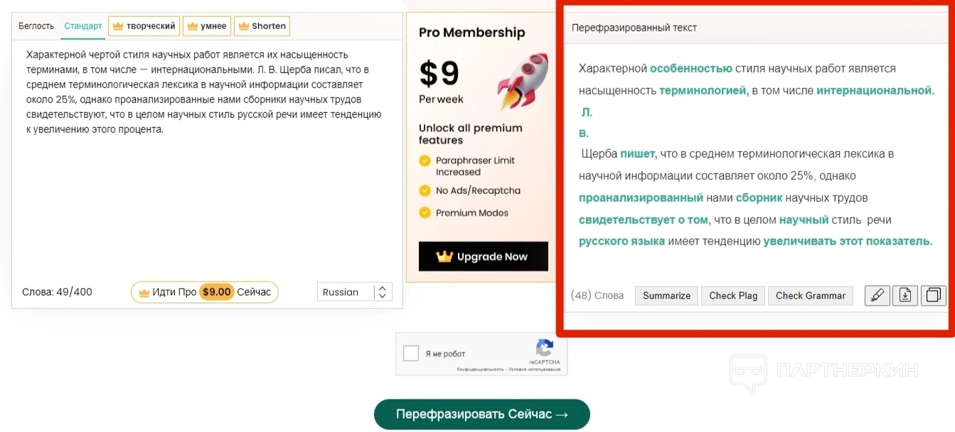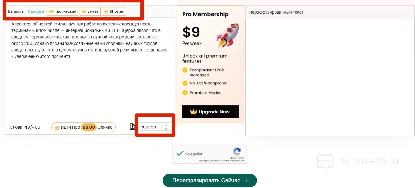 Далее отправляем текст на перефразирование, указываем русский язык и стандартный режим.