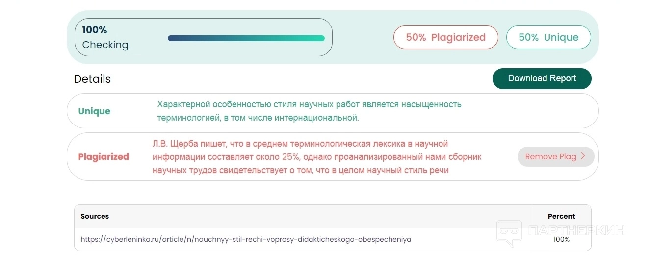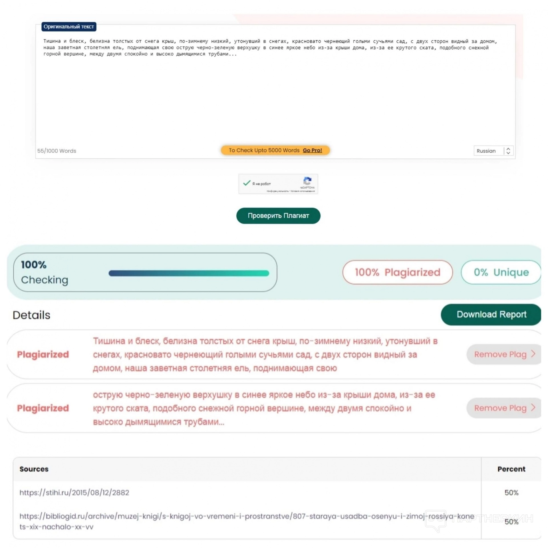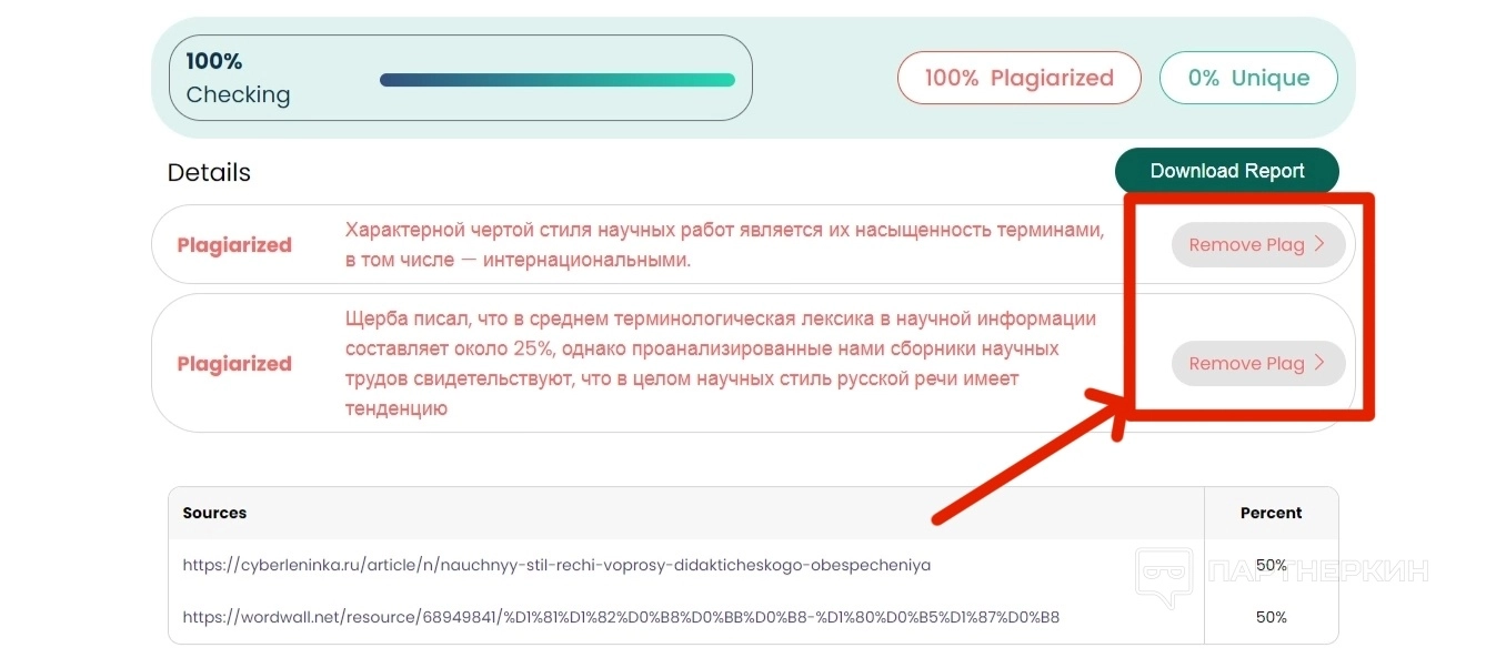 Предоставление результатов занимает менее минуты. На скриншоте видно, что текст состоит полностью из плагиата (показатель 100%), а также указаны возможные источники. Сам текст инструмент разбил на смысловые отрезки и абзацы, каждый из которых можно заменить по отдельности. Для этого нажимаем на Remove Plag напротив нужного отрывка.