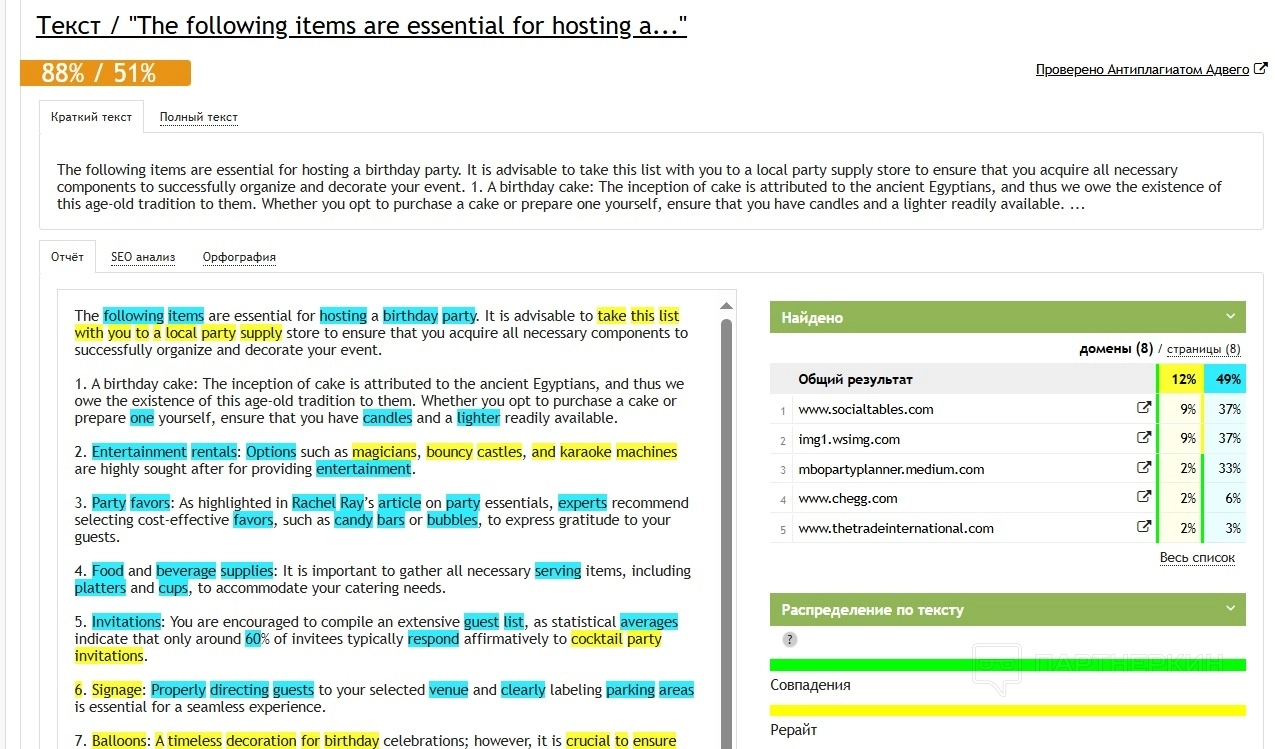 Затем проанализируем, достаточно ли уникальным получился текст. Для режима Formal уникальность уже достигнута гораздо выше: