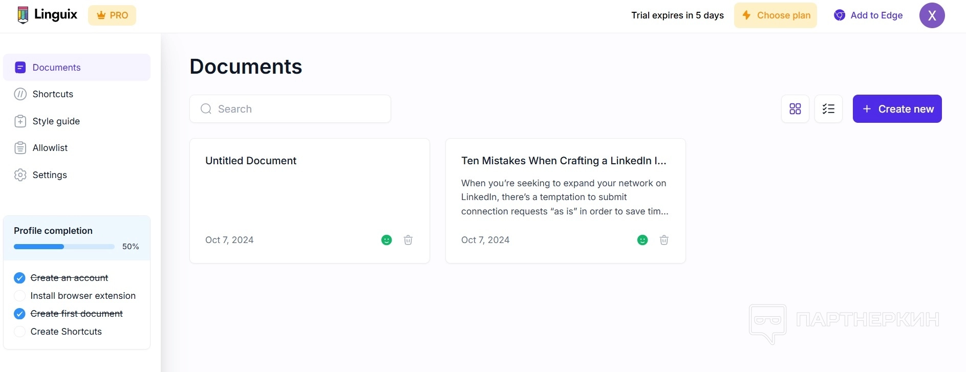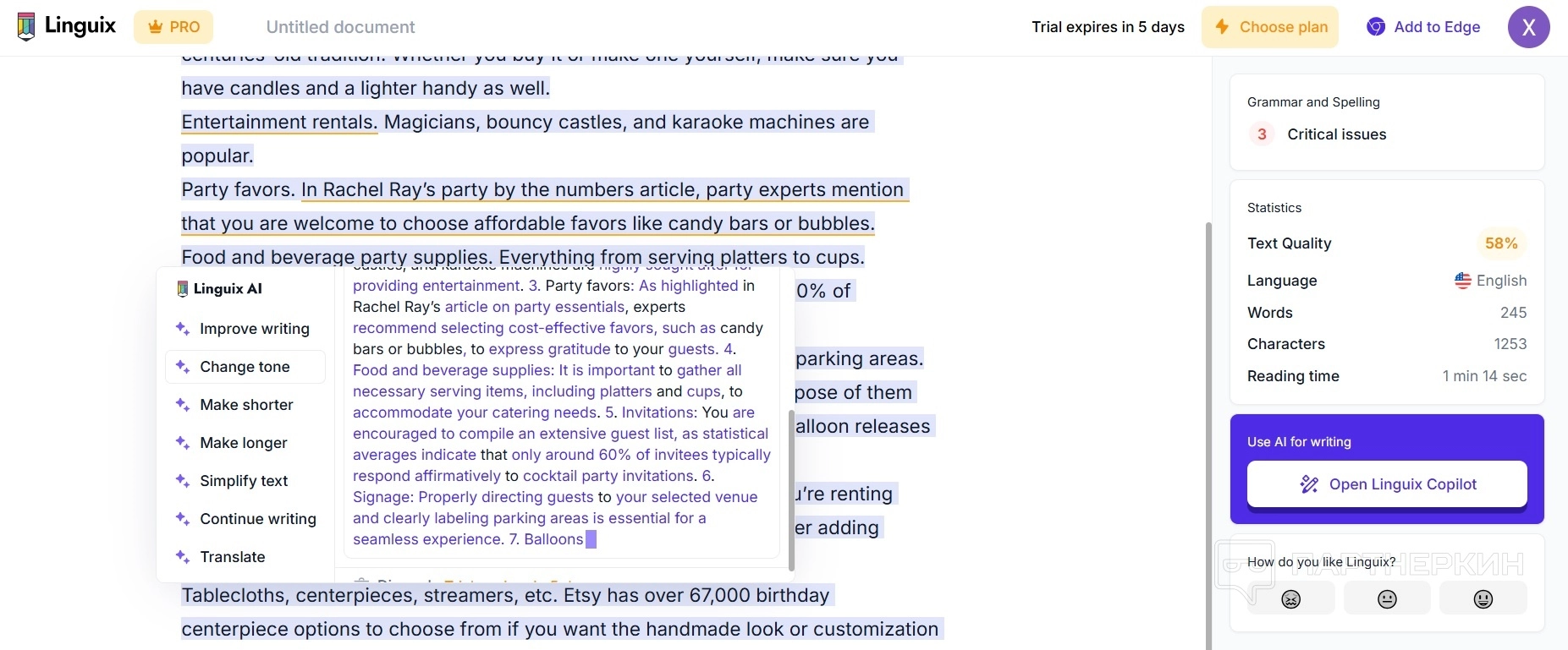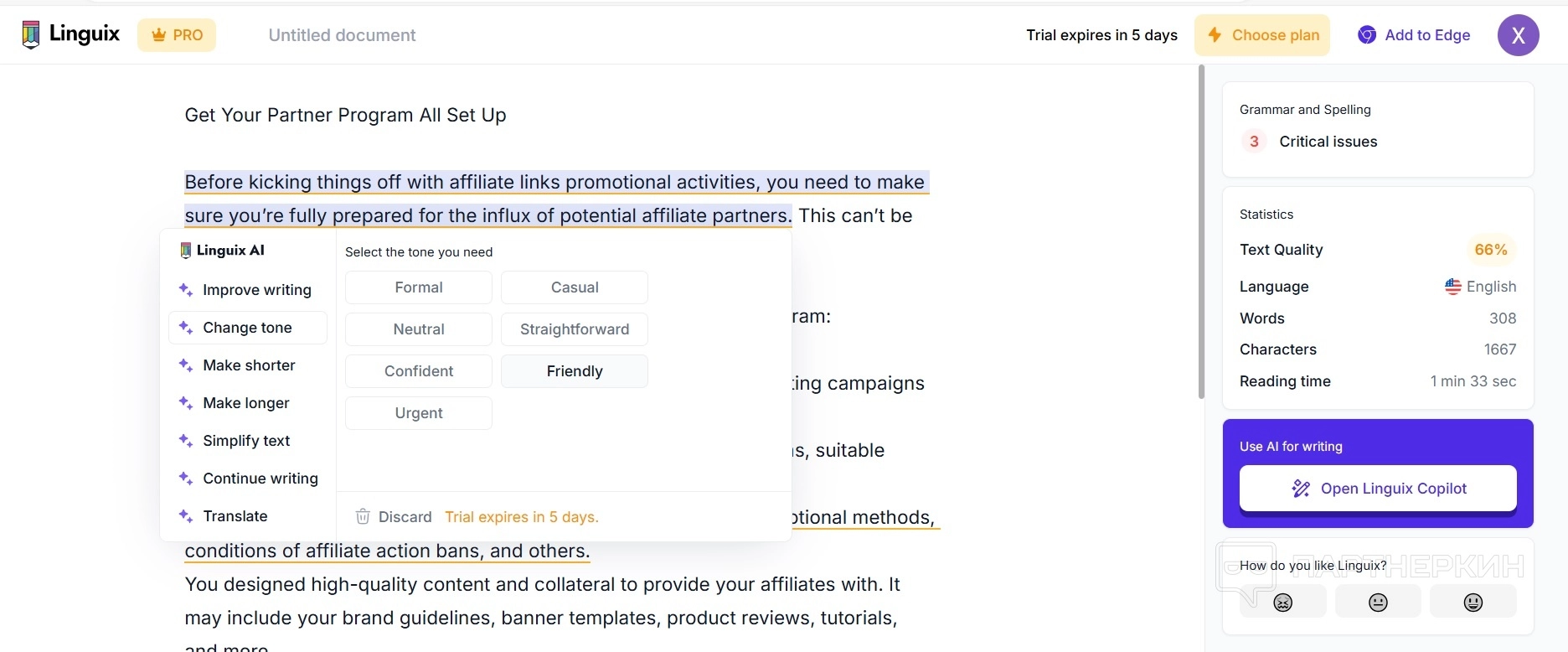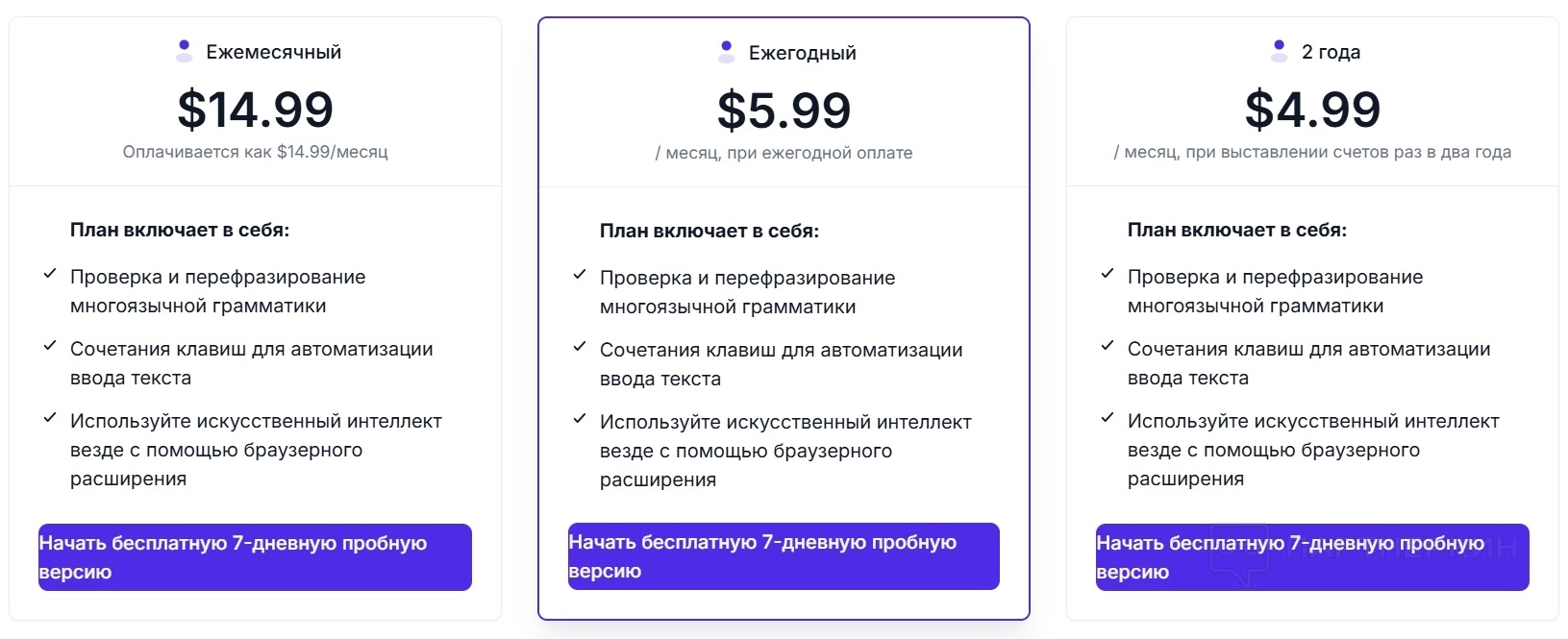 Бесплатный пробный период. Перед тем как выбрать тарифный план, можно воспользоваться бесплатным пробным периодом на 7 дней. Этот период позволяет оценить все функции Linguix без каких-либо обязательств, что дает возможность понять, как сервис может улучшить навыки письма и повысить эффективность.