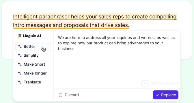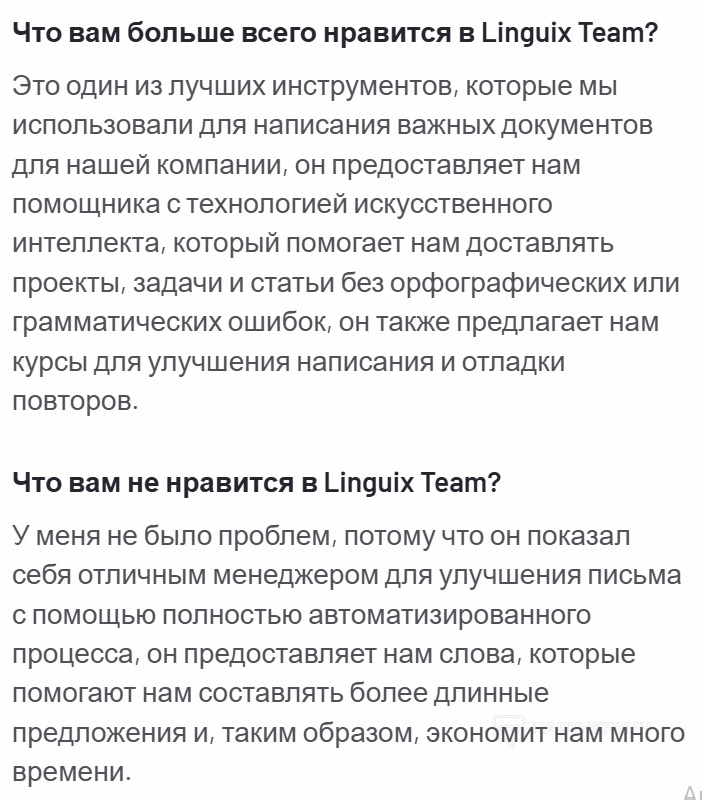 Корпоративные клиенты ценят Linguix за хорошо продуманные алгоритмы ИИ, которые позволяют быстро и оперативно работать с электронными письмами, исключать ошибки, а также повторять или рерайтить тексты: