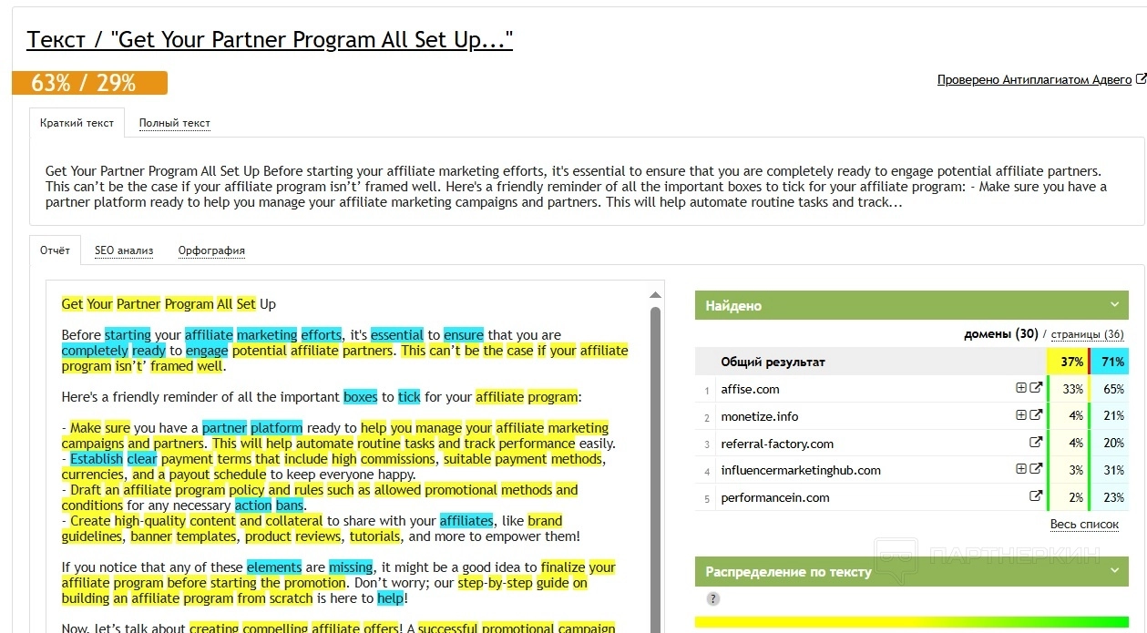 И посмотрим, какую уникальность покажет сервис проверки антиплагиата. Уникальность получилась не очень высокая, однако больше всего совпадений с оригинальным сайтом Affise. То есть этот режим можно использовать, если создатель сайта хочет адаптировать свои тексты к другим площадкам, но видоизменить их подачу.