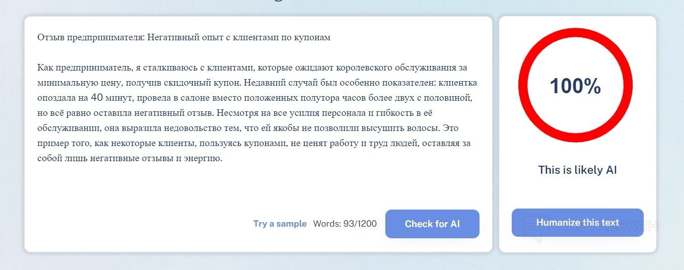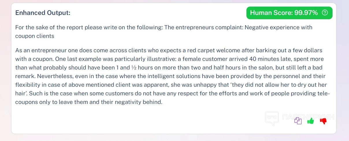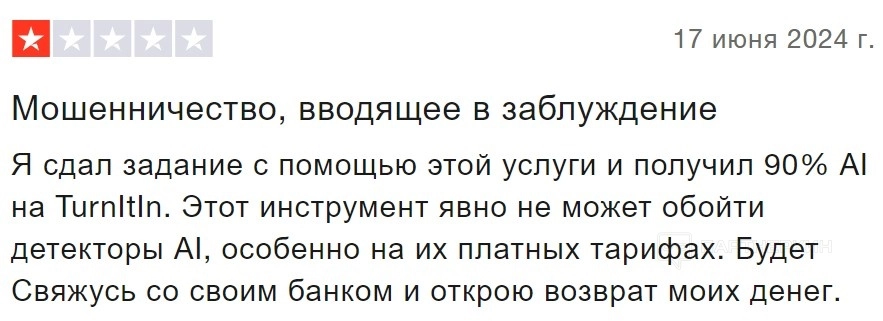 Однако не все отзывы положительные. Один из пользователей выразил недовольство тем, что сервис не всегда справляется с задачей обхода мощных AI-детекторов. При проверке на Turnitin текст показал 90% вероятности, что он создан искусственным интеллектом. Это ставит под сомнение эффективность WriteHuman для обхода таких систем.