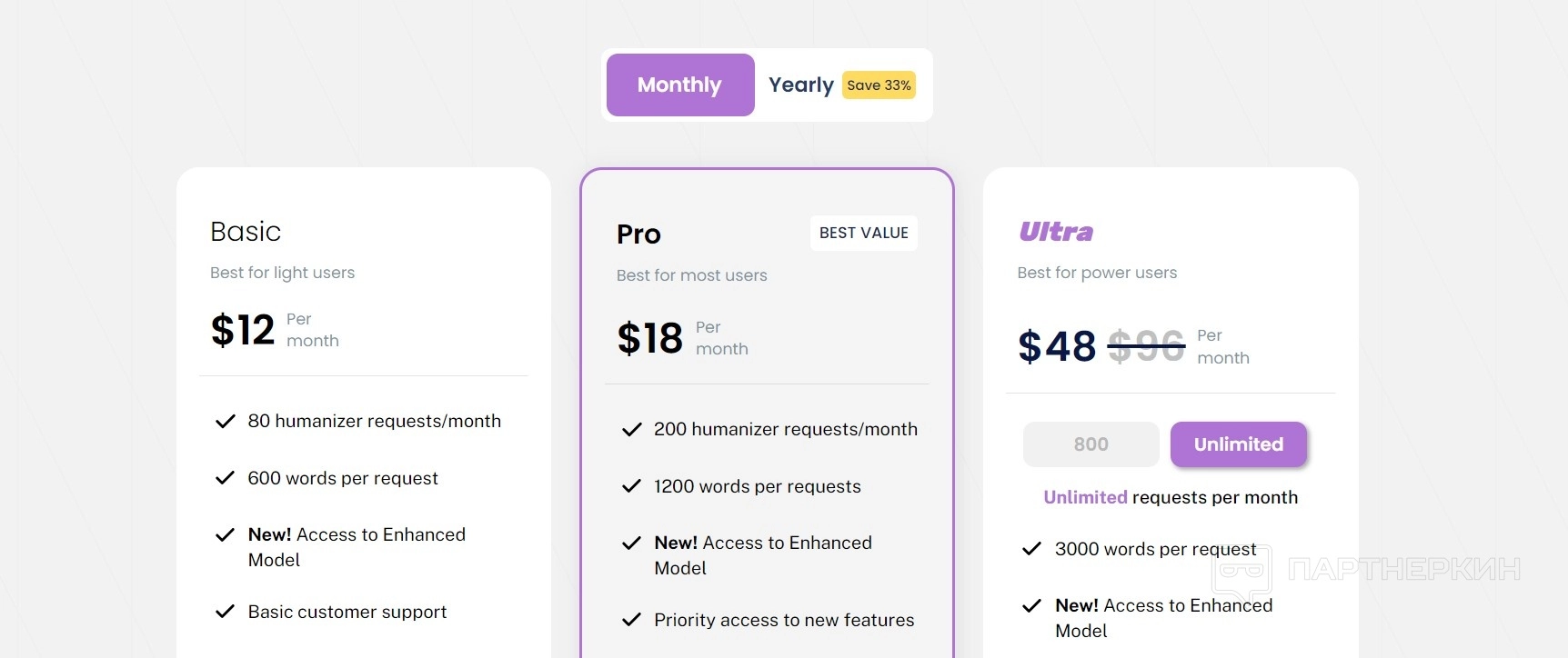Подходит для более активных пользователей. Тариф предлагает 80 запросов в месяц для AI Humanizer с возможностью обработки до 600 слов за один запрос (4 500 символов). Пользователи этого плана получают доступ к обновленной модели и базовую поддержку клиентов.