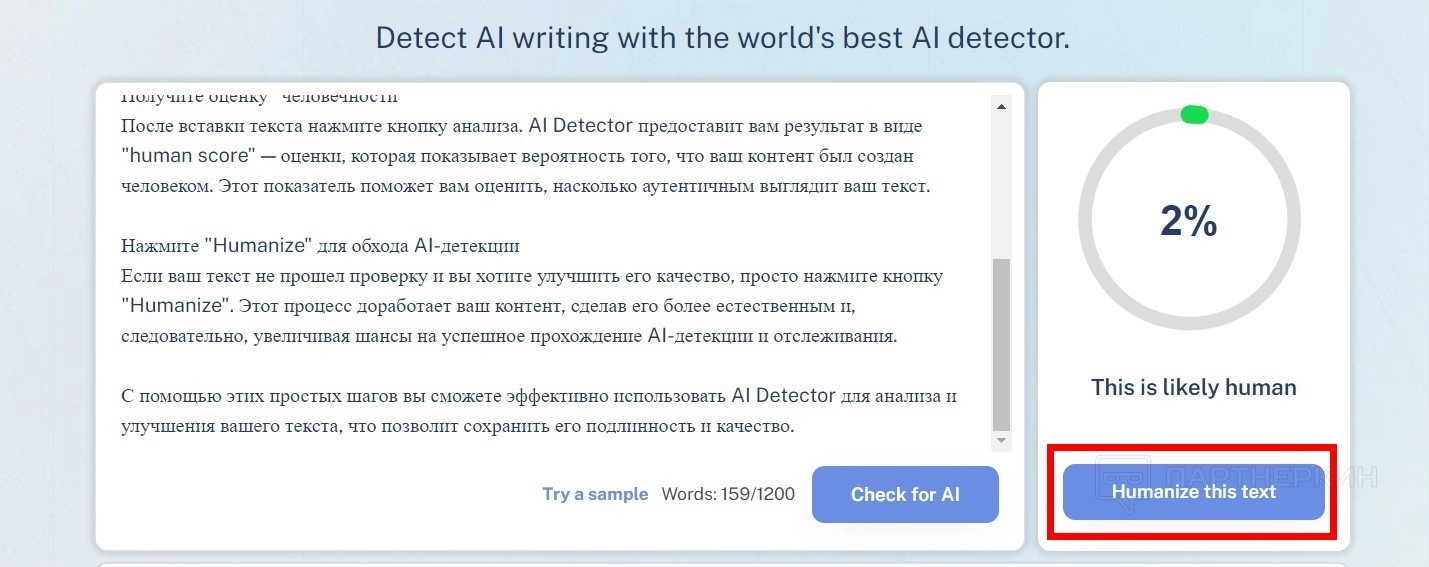 - Если ваш текст не прошел проверку и вы хотите улучшить его качество, просто нажмите кнопку Humanize this text . Этот процесс доработает ваш контент, сделав его более естественным.