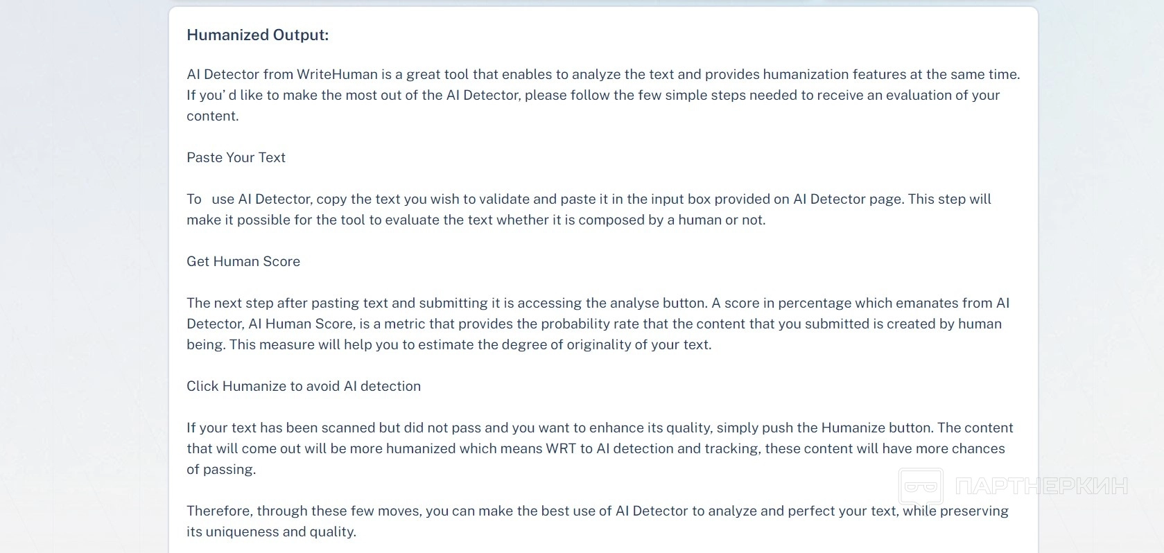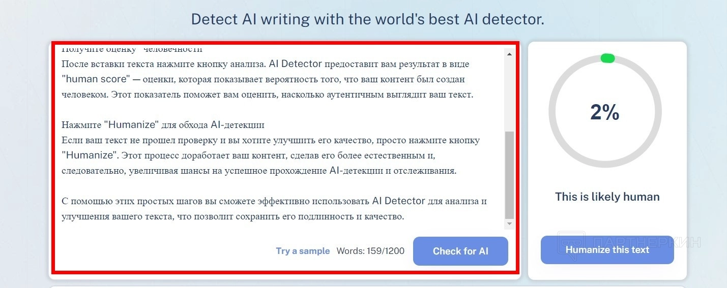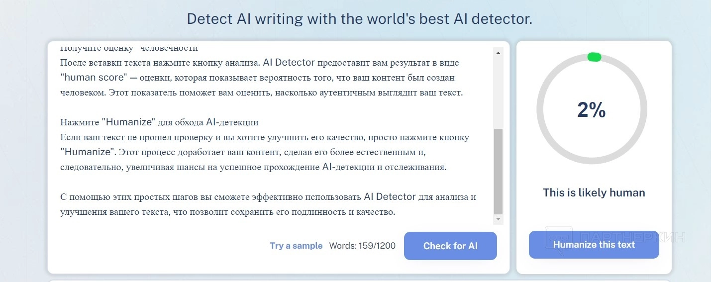 При попытке «очеловечивания» текста с помощью AI Detector система обычно выдает результат в диапазоне 0-3%.