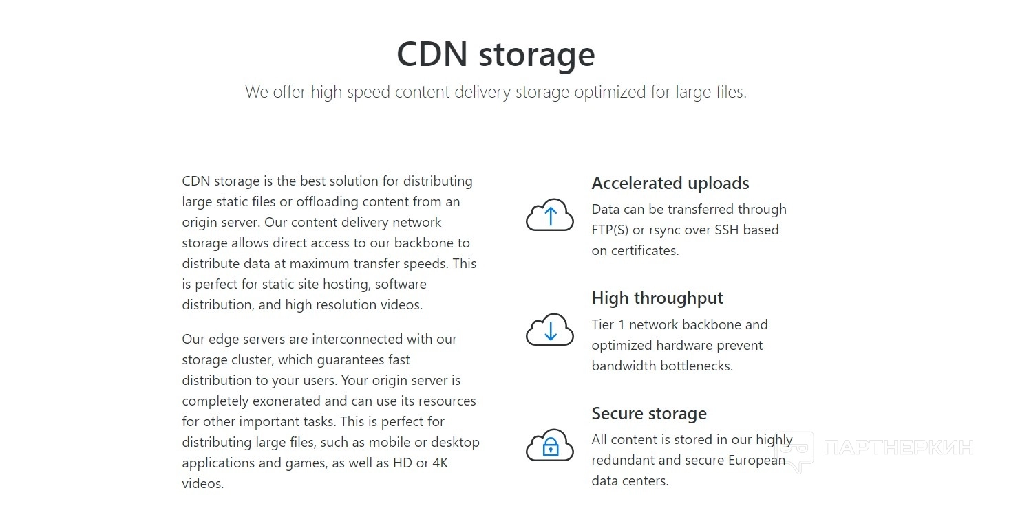 Это место на удаленном сервере для сохранения данных. Подходит для распределения контента, такого как программы, приложения и видео в высоком разрешении, а также для разгрузки исходного сервера. Благодаря доступу к магистральной сети, хранилище