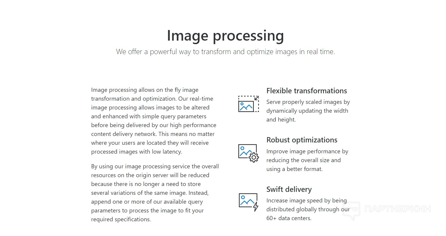 - Быстрая доставка . Обработка изображений с низкой задержкой благодаря 60+ дата-центрам по всему миру.