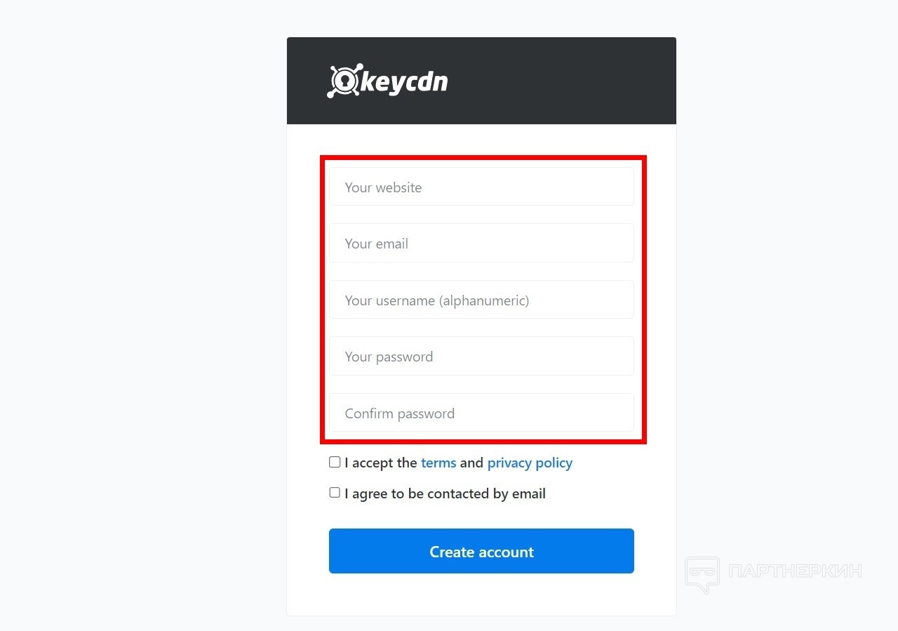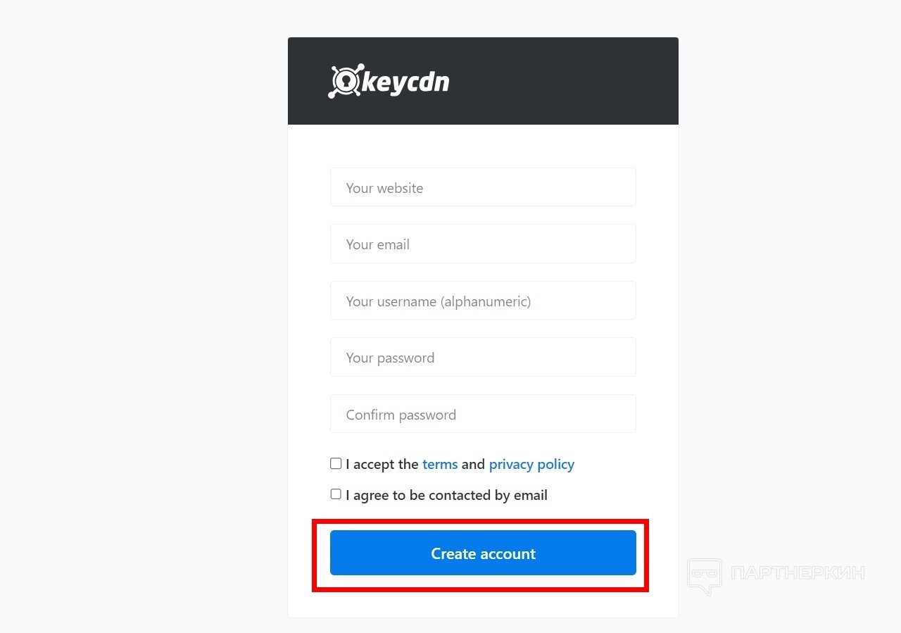 - Заполните регистрационную форму. Укажите ваш веб-сайт, email, имя. придумайте и повторите пароль.