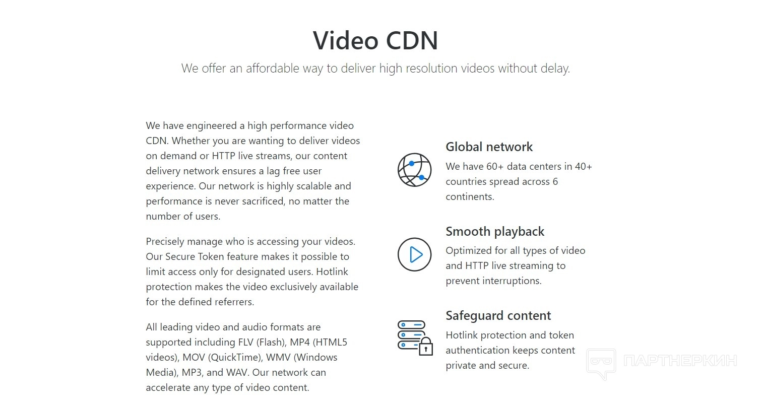 - Защита контента . Токен авторизации и защита от хотлинков сохраняют видео в безопасности.