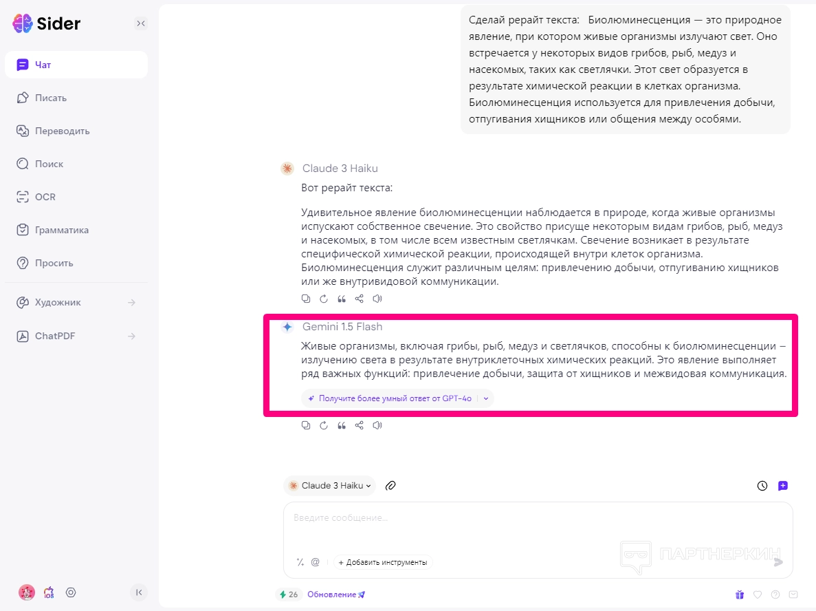 В чате сразу под результатом появляется кнопка «Получить более умный ответ от…» с возможностью выбора любой другой модели. Попробуем сделать рерайт этого же текста с помощью модели Gemini 1.5 Flash: