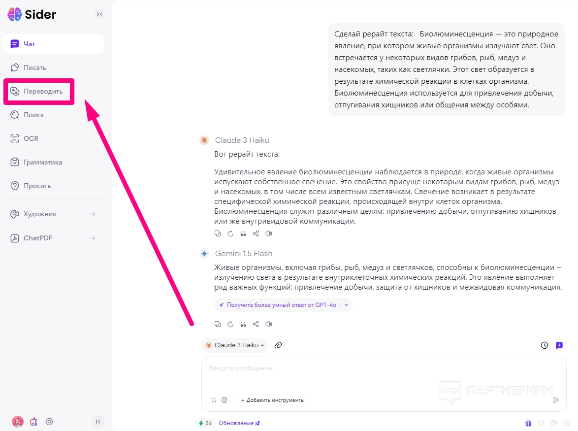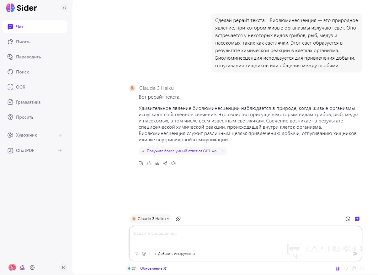 Попробуем поработать с текстом с помощью этого инструмента, чтобы понять, насколько это удобно. Для примера сделаем рерайт текста с помощью одной из моделей ИИ. Пусть для начала это будет Claude 3 Haiku. Вставляем текст в поле для ввода и пишем, что нужно сделать рерайт: