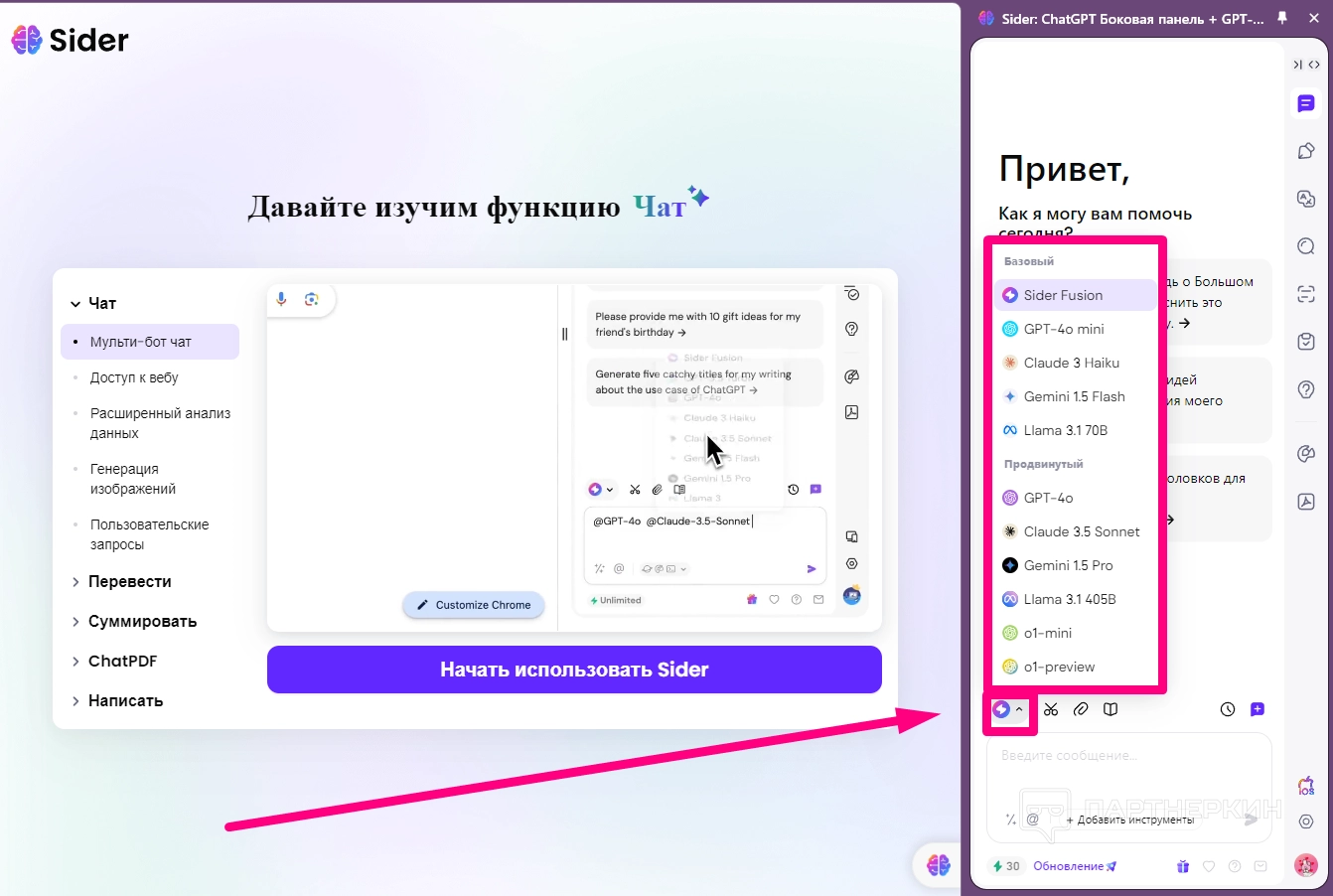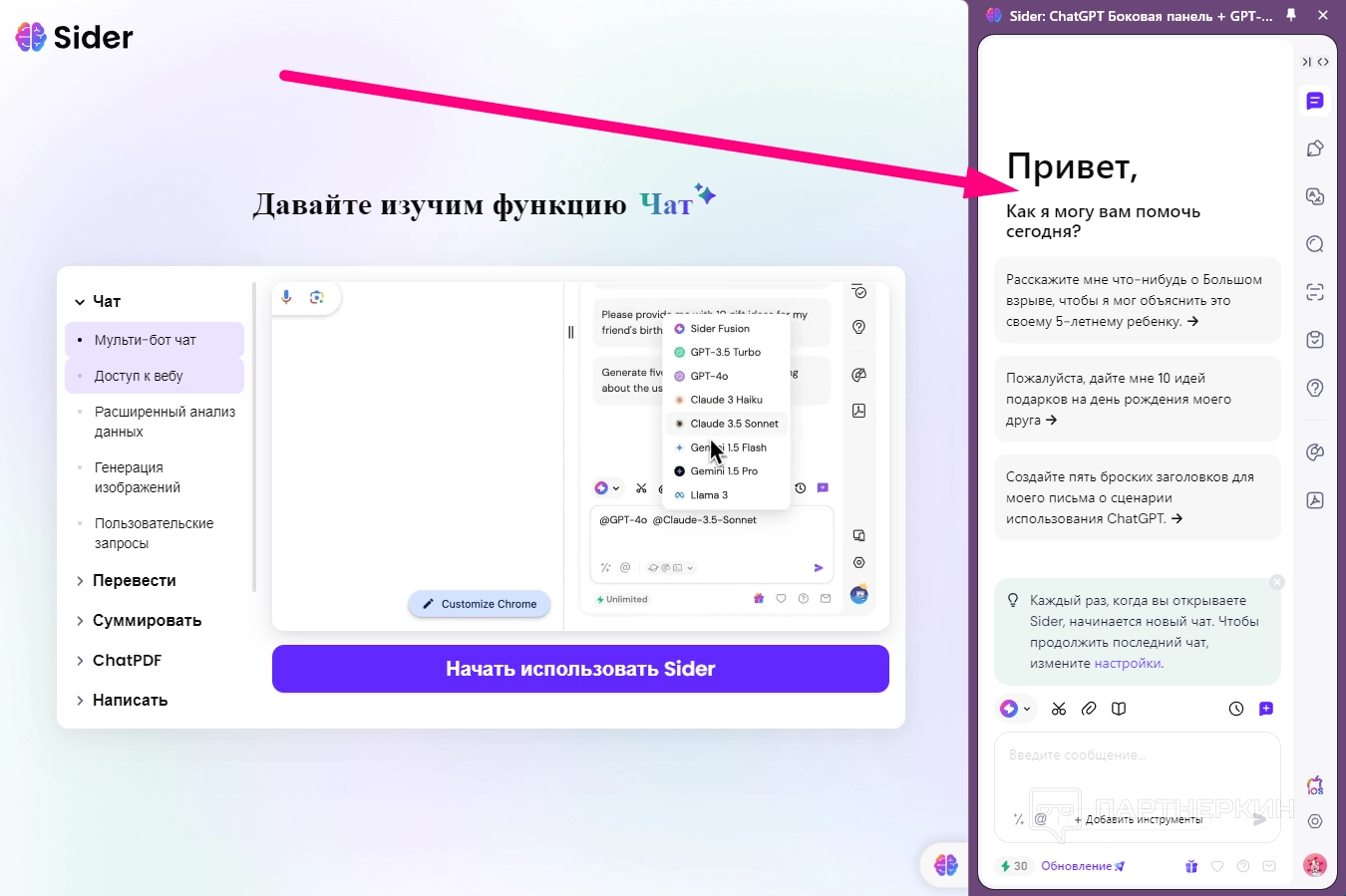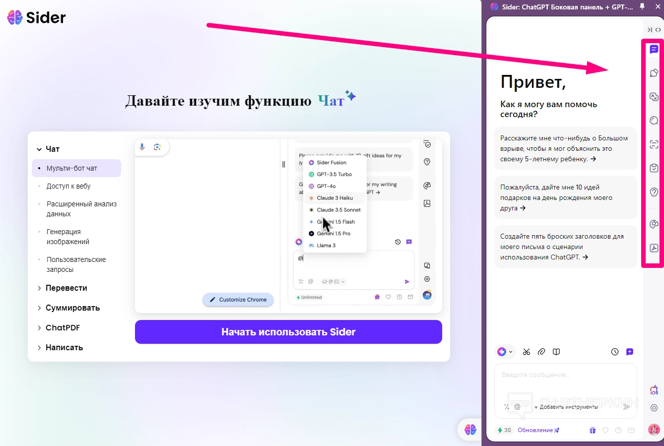 Расширение работает прямо из браузера, где кнопка постоянно видна на экране. Достаточно одного клика, чтобы открыть боковую панель и сразу приступить к работе с нейросетями, например, с ChatGPT.