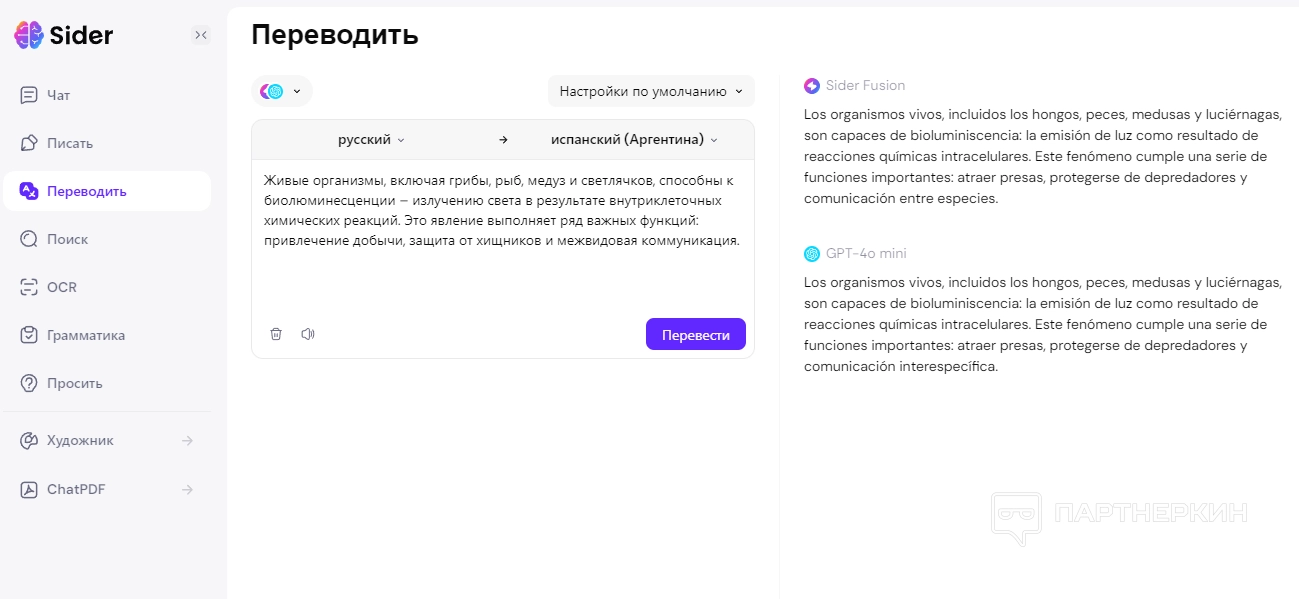 Удобно, что в этом же чате полученный результат можно сразу перевести на любой язык. Для этого в панели слева выбираем опцию «Переводить», выбираем язык и видим два варианта перевода: