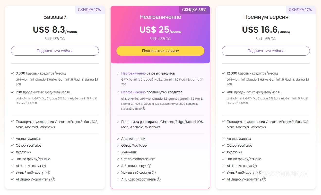 - Премиум версия — $16.6 в месяц или $199 в год. Включает 12,000 базовых кредитов и 400 продвинутых кредитов ежемесячно, с поддержкой расширенных моделей ИИ.