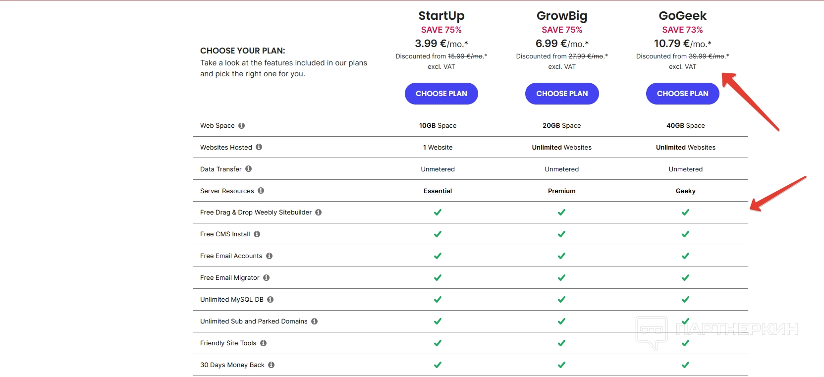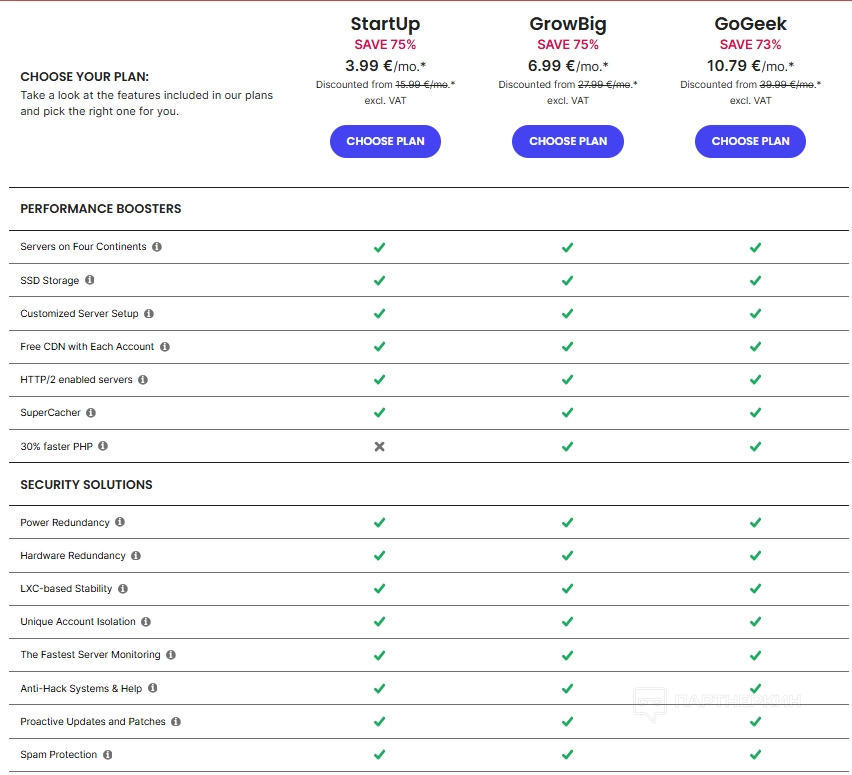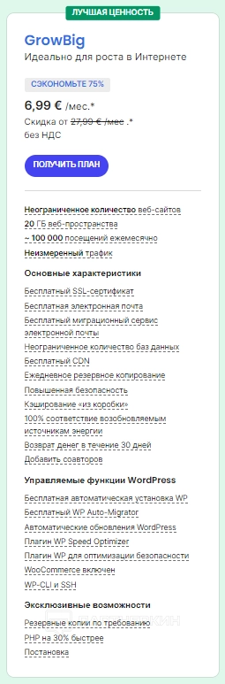 - GrowBig (6,99 € в месяц, скидка 75%, обычная цена 27,99 €) — идеален для растущих проектов. Предлагает неограниченное количество сайтов, 20 ГБ пространства и до 100 000 посещений в месяц. Все преимущества тарифа Запуск плюс более быстрый PHP и возможность резервного копирования по запросу.